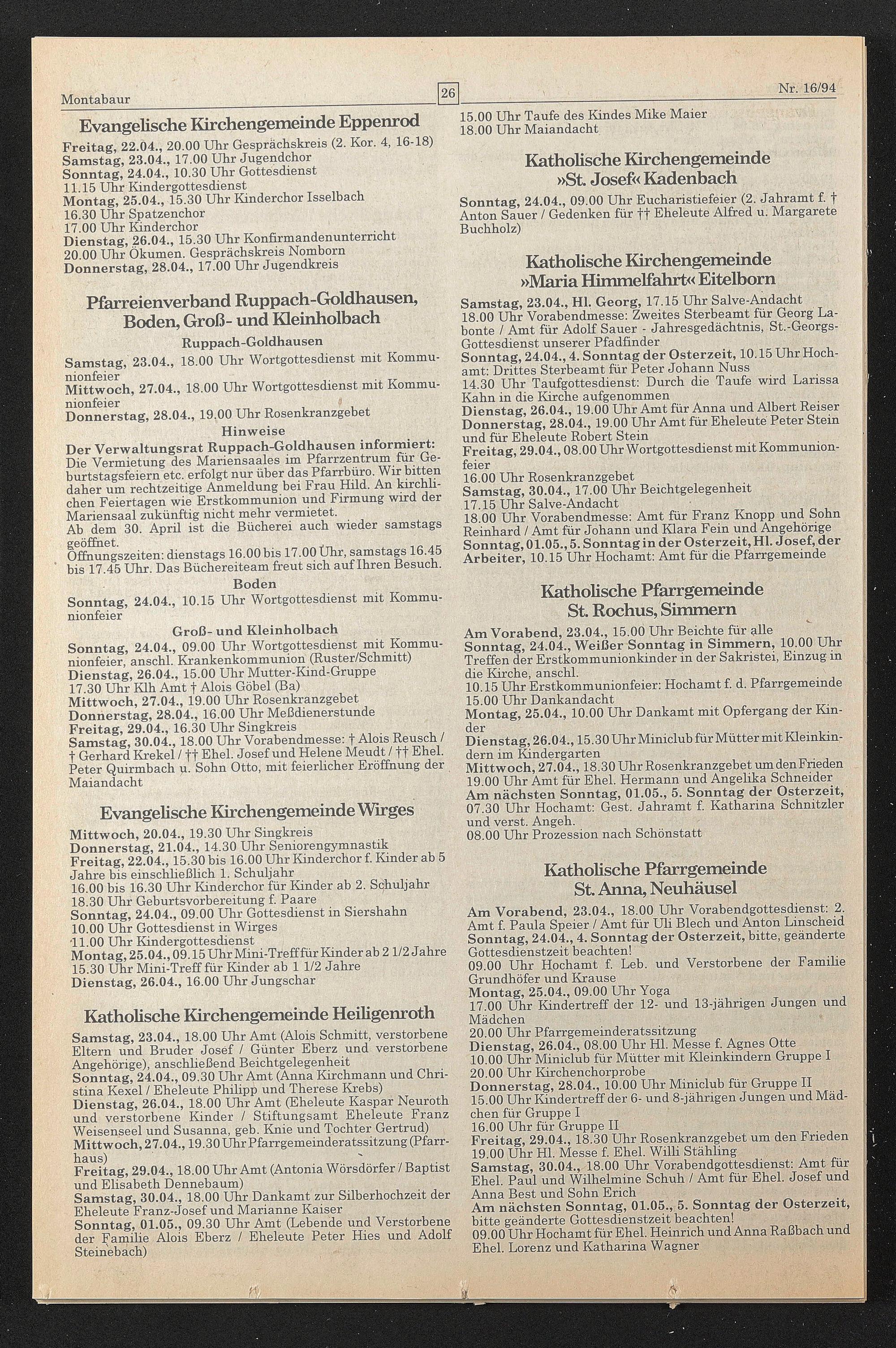 Dienstag, 26.04., 18.00 Uhr Amt (Eheleute Kaspar Neuröth und verstorbene Kinder / Stiftungsamt Eheleute Franz Weisenseel und Susanna, geh. Knie und Tochter Gertrud) Mittwoch, 27.04., 19.30 Uhr Pfarrgemeinderatssitzung (Pfarrhaus)