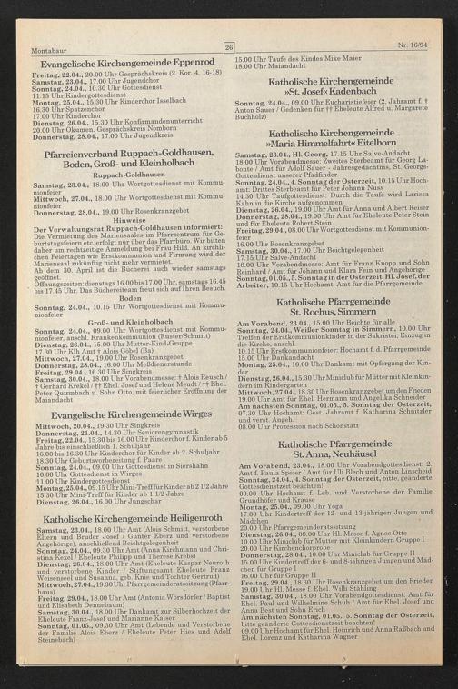 Samstag, 30.04., 18.00 Uhr Dankamt zur Silberhochzeit der Eheleute Franz-Josef und Marianne Kaiser Sonntag, 01.05., 09.30 Uhr Amt (Lebende und Verstorbene der Familie Alois Eberz / Eheleute Peter Hies und Adolf Steinebach)