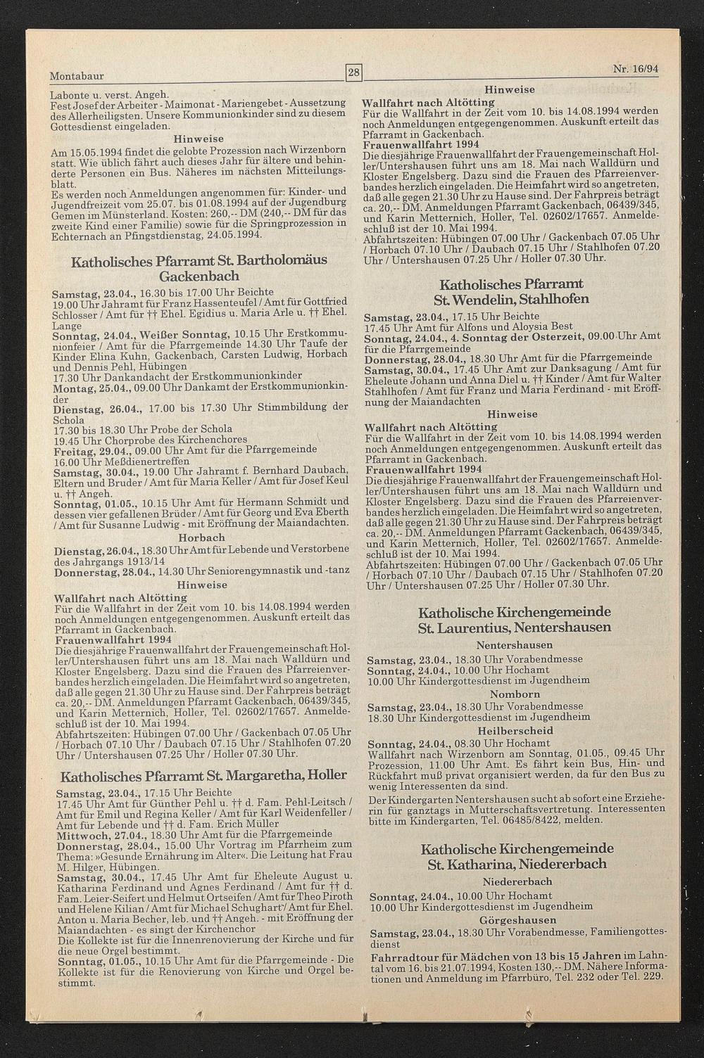 Für die Wallfahrt in der Zeit vom 10. bis 14.08.1994 werden noch Anmeldungen entgegengenommen. Auskunft erteilt das Pfarramt in Gackenbach.