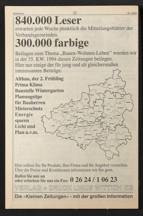 Beilagen zum Thema „Bauen-Wohnen-Leben” werden wir in der 35. KW. 1994 diesen Zeitungen beilegen.