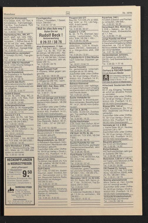 350 I, VB DM 1.800,-, Escort Laser 1,3, Bj. 85, TÜV 96, 80.000 km, VB DM 4.000,-, Reifen für Fiesta, 500 km gelaufen, Typ 1,4, VB DM 350,-, Eichenbalken zu verkaufen, sehr alt, Meter DM 10,-.