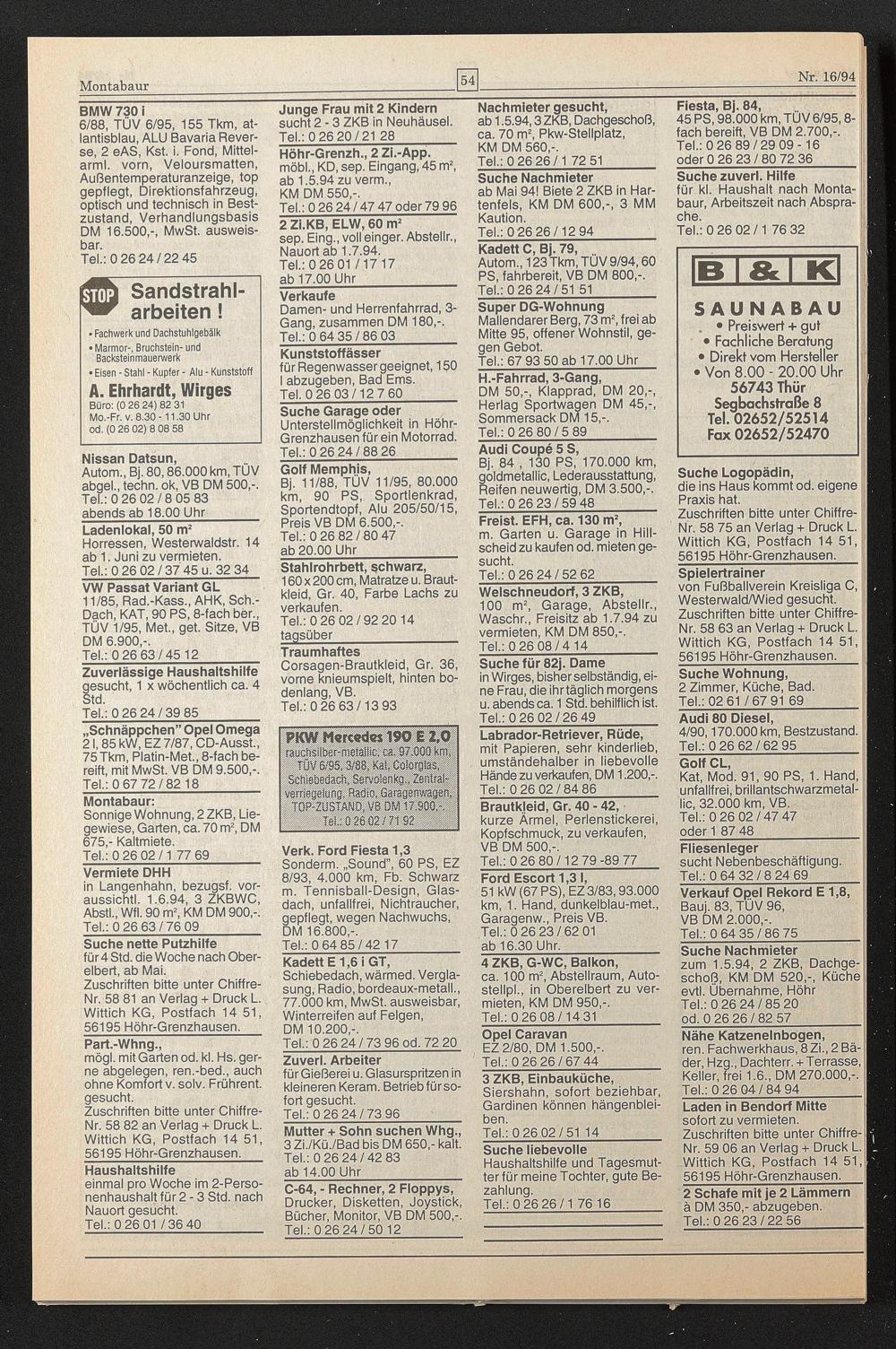 Zuschriften bitte unter Chiffre- Nr. 58 75 an Verlag + Druck L. Wittich KG, Postfach 14 51, 56195 Höhr-Grenzhausen.