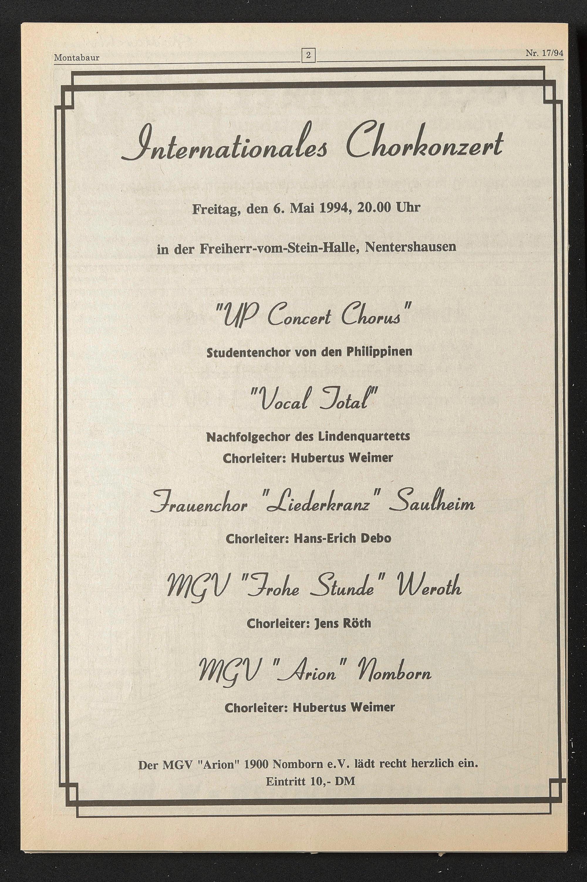 Der MGV "Arion" 1900 Nomborn e.V. lädt recht herzlich ein.