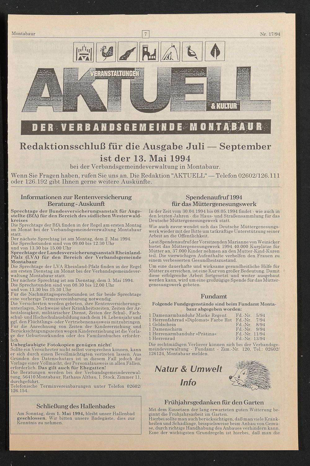 In der Zeit vom 30.04.1994 bis 08.05.1994 findet - wie auch in den letzten Jahren - die Haus- und Straßensammlung für das Deutsche Müttergenesungswerk statt.