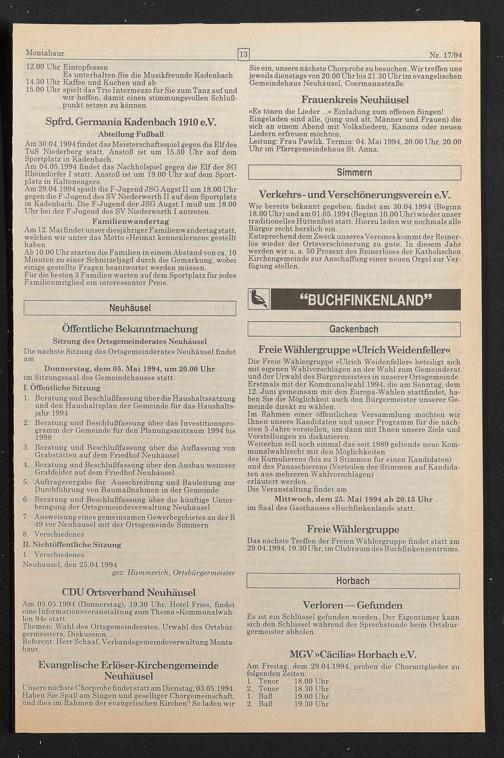Am 05.05.1994 (Donnerstag), 19.30 Uhr, Hotel Fries, findet eine Informationsveranstaltung zum Thema »Kommunalwahlen 94« statt.