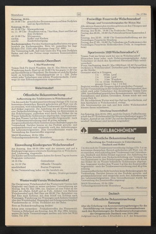 Der Zweigverein Welschneudorf des Westerwald-Vereins lädt Mitglieder und Gäste zu seiner- nächsten Unternehmung am Montag, dem 02. Mai 1994, ein. Geplant ist eine Fahrt an die Mosel mit »Bahn, Schiff und zu Fuß«. Abfahrt vom Rathaus Welschneudorf nach Bad Ems um 08.00 Uhr; Bahnfahrt von Bad Ems nach Koblenz; mit dem Schiff von Koblenz nach Winningen; Wanderung von Winningen nach Kobern-Gondorf über den Weinlehrpfad, Hexenpfad und Schoppenstecherpfad. Wanderstrecke ca. 10 km. Rückfahrt mit der Bahn.