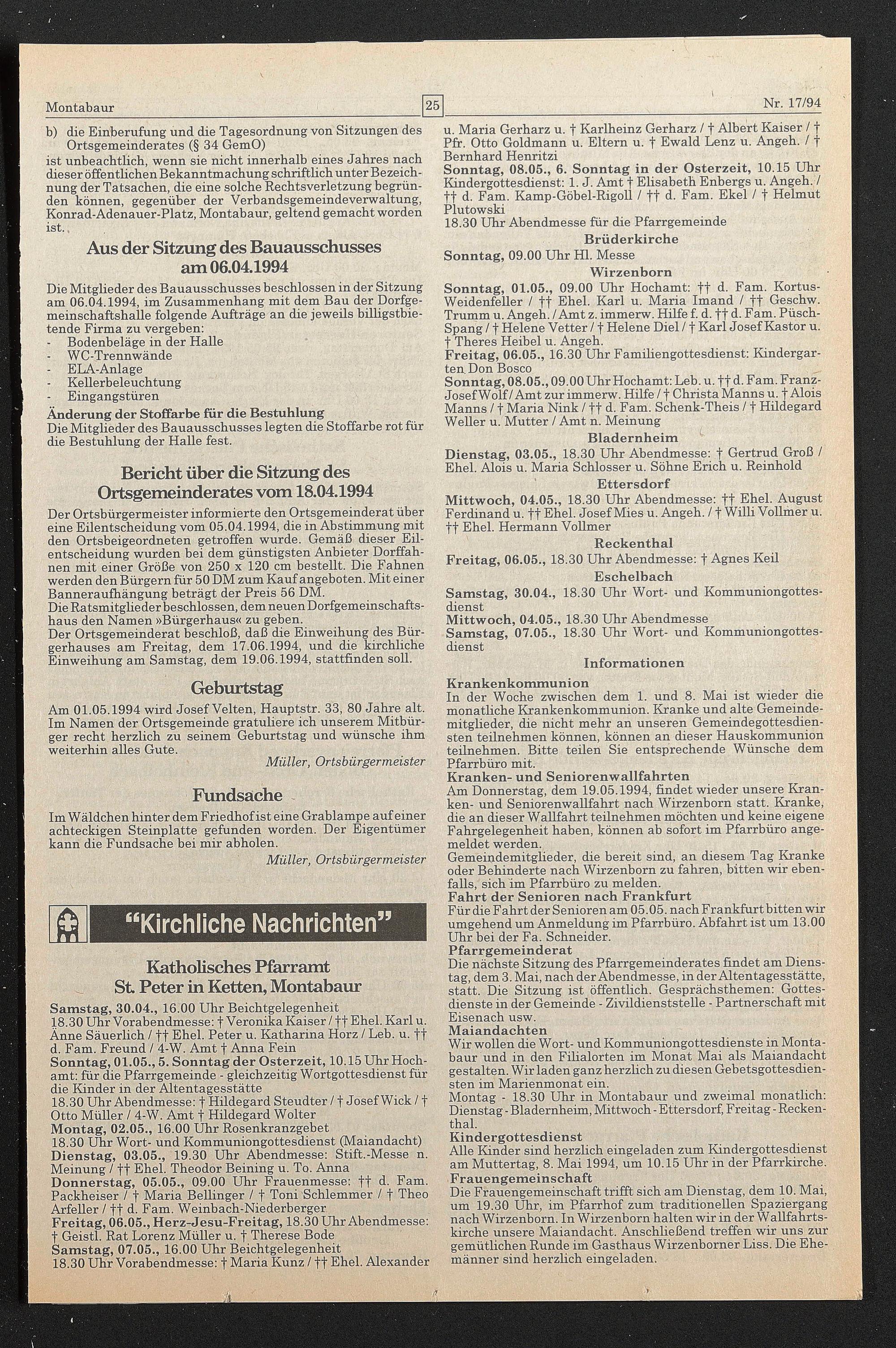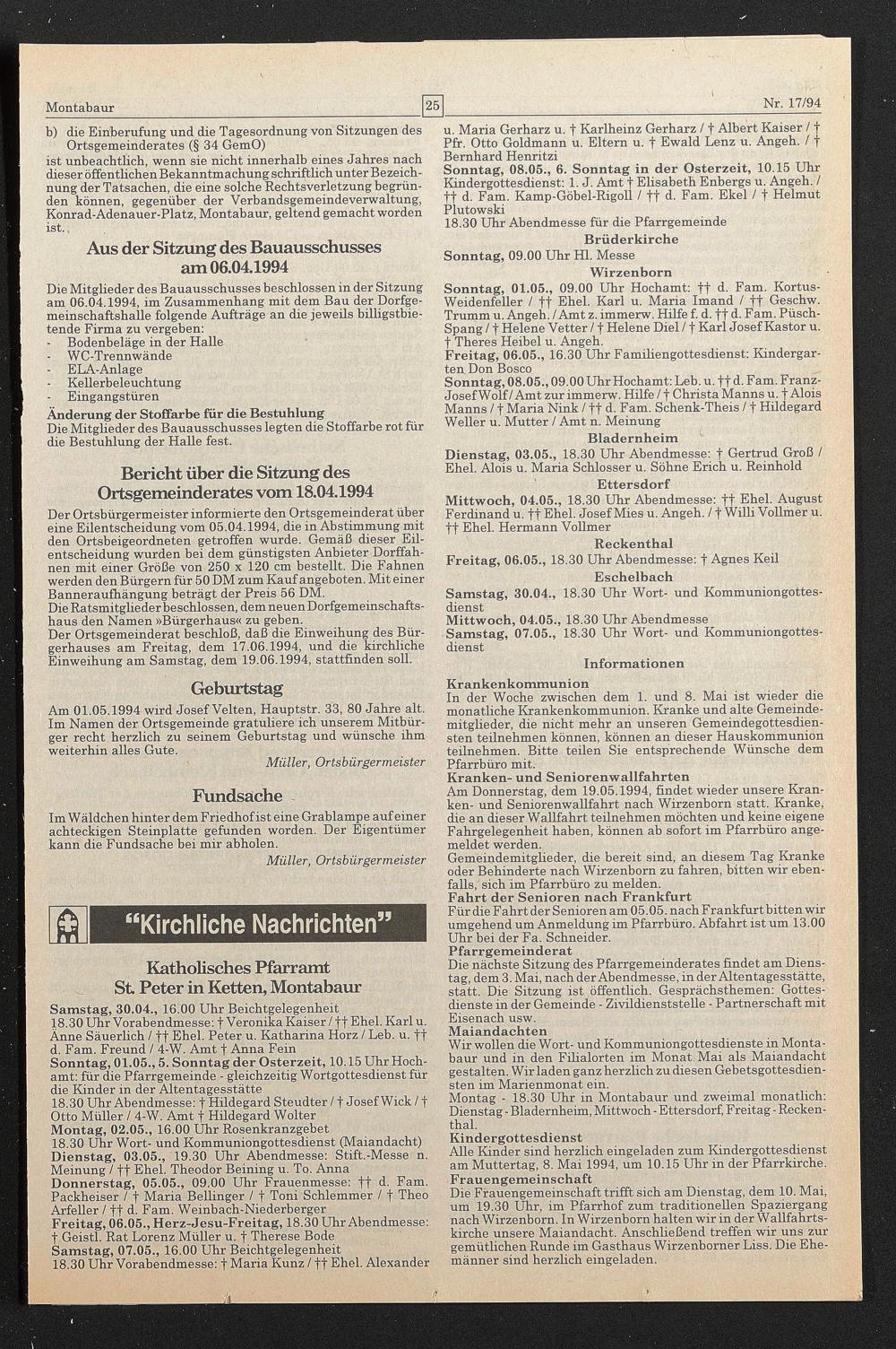 Bericht über die Sitzung des Ortsgemeinderates vom 18.04.1994