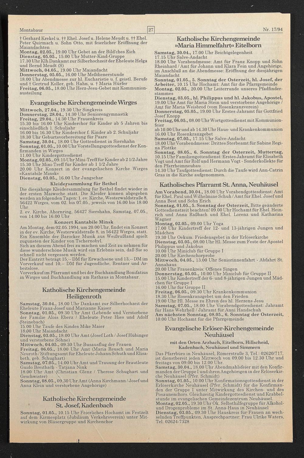 Am Montag, dem 02.05.1994, um 20.00 Uhr, findet ein Konzert in der ev. Kirche, Westerwaldstraße 8, in 56422 Wirges, statt. Ein Ensemble der Barocker Musik aus Weißrußland spielt zugunsten der Kinder von Tschernobyl.