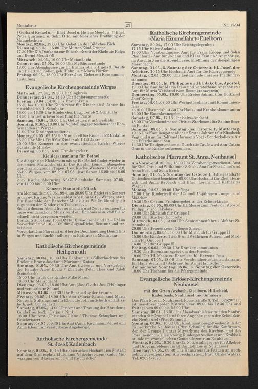 Samstag, 30.04., 18.00 Uhr Dankamt zur Silberhochzeit der Eheleute Franz-Josef und Marianne Kaiser Sonntag, 01.05., 09.30 Uhr Amt (Lebende und Verstorbene der Familie Alois Eberz / Eheleute Peter Hies und Adolf 'Steinebach)