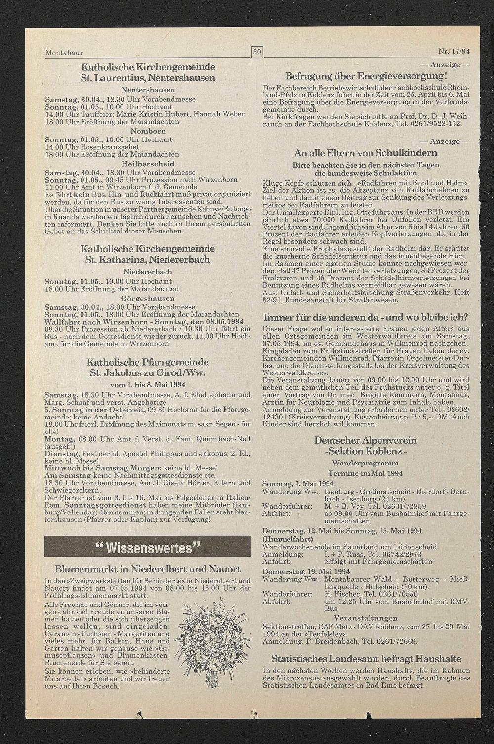 In den »Zweigwerkstätten für Behinderte« in Niederelbert und Nauort findet am 07.05.1994 von 08.00 bis 16.00 Uhr der Frühlings-Blumenmarkt statt.