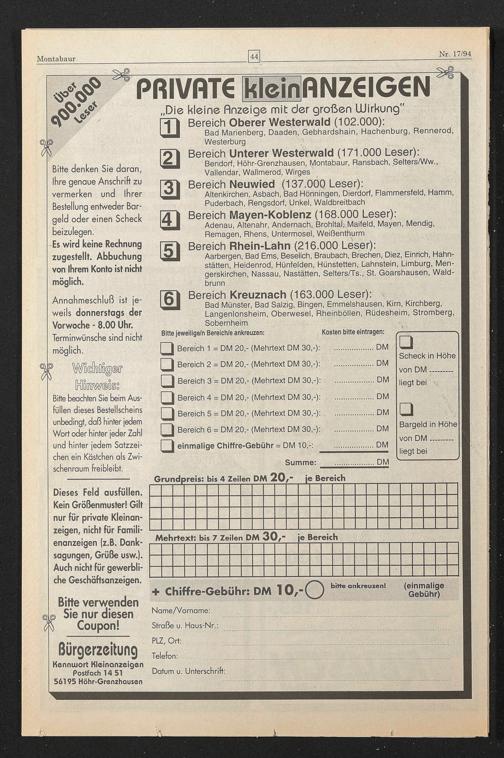 Kennwort Kleinanzeigen Postfach 14 51 56195 Höhr-Grenzhausen