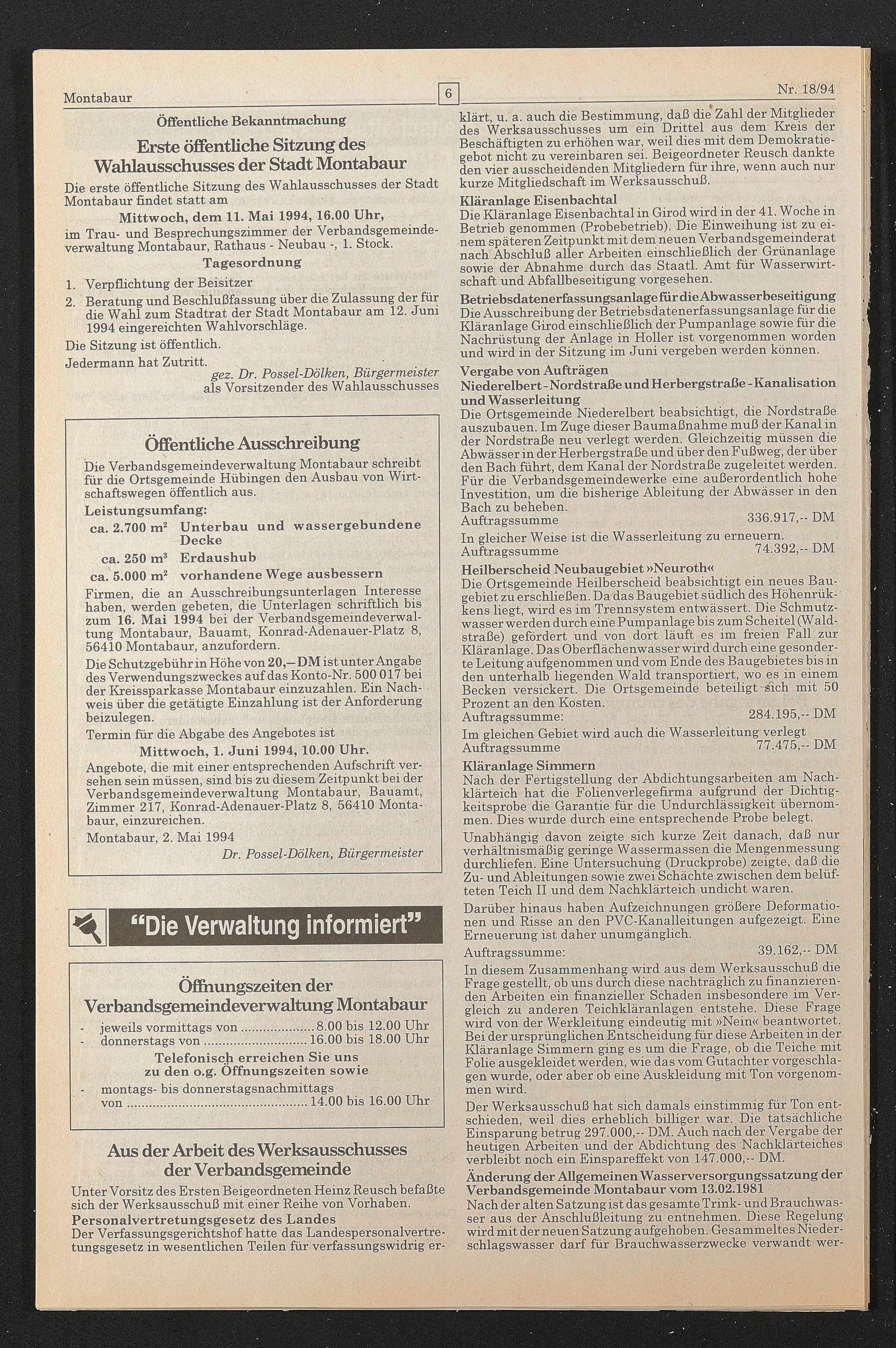 Mittwoch, dem 11. Mai 1994,16.00 Uhr, im Trau- und Besprechungszimmer der Verbandsgemeindeverwaltung Montabaur, Rathaus - Neubau -, 1. Stock. Tagesordnung