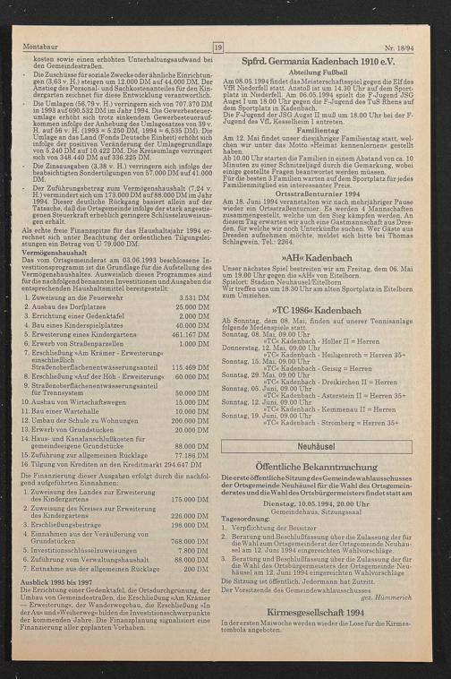 Dienstag, 10.05.1994, 20.00 Uhr Gemeindehaus, Sitzungssaal