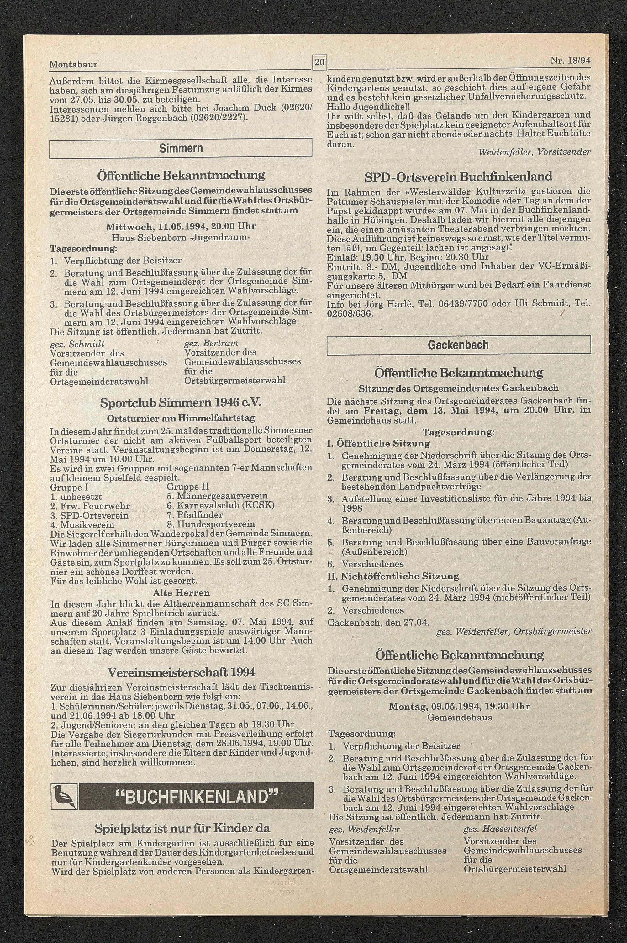 Die nächste Sitzung des Ortsgemeinderates Gackenbach findet am Freitag, dem 13. Mai 1994, um 20.00 Uhr, im Gemeindehaus statt.