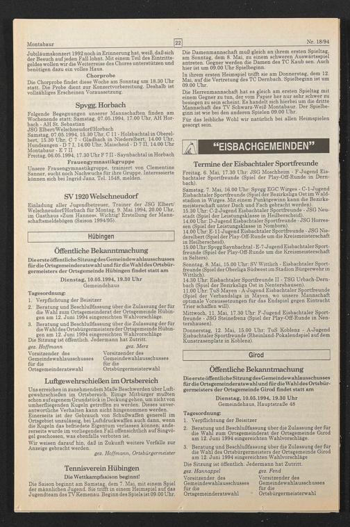 Samstag, 07.05.1994,15.30 Uhr, C 11 - Holzbachtal in Oberelbert, 15.30 Uhr, C 7 - Gladbach in Niederelbert, 14.00 Uhr, Hundsangen - D 7 I, 14.00 Uhr, Maischeid - D 7 II, 14.00 Uhr Montabaur - E 7 II