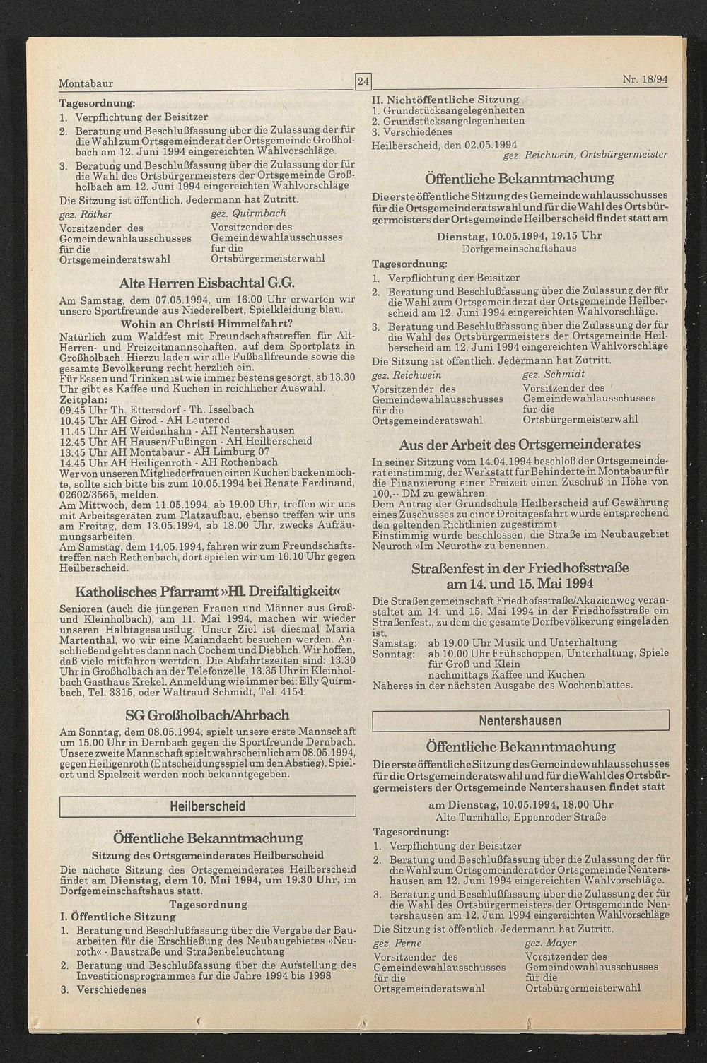 Die nächste Sitzung des Ortsgemeinderates Heilberscheid findet am Dienstag, dem 10. Mai 1994, um 19.30 Uhr, im Dorfgemeinschaftshaus statt.