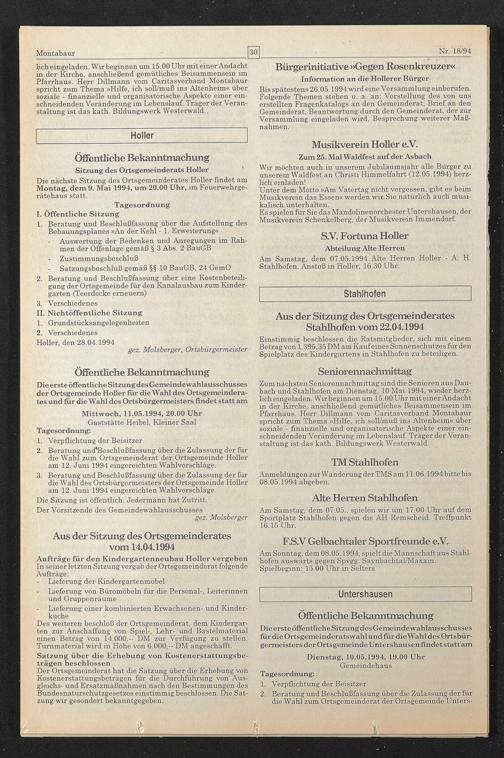 Aus der Sitzung des Ortsgemeinderates Stahlhofen vom 22.04.1994