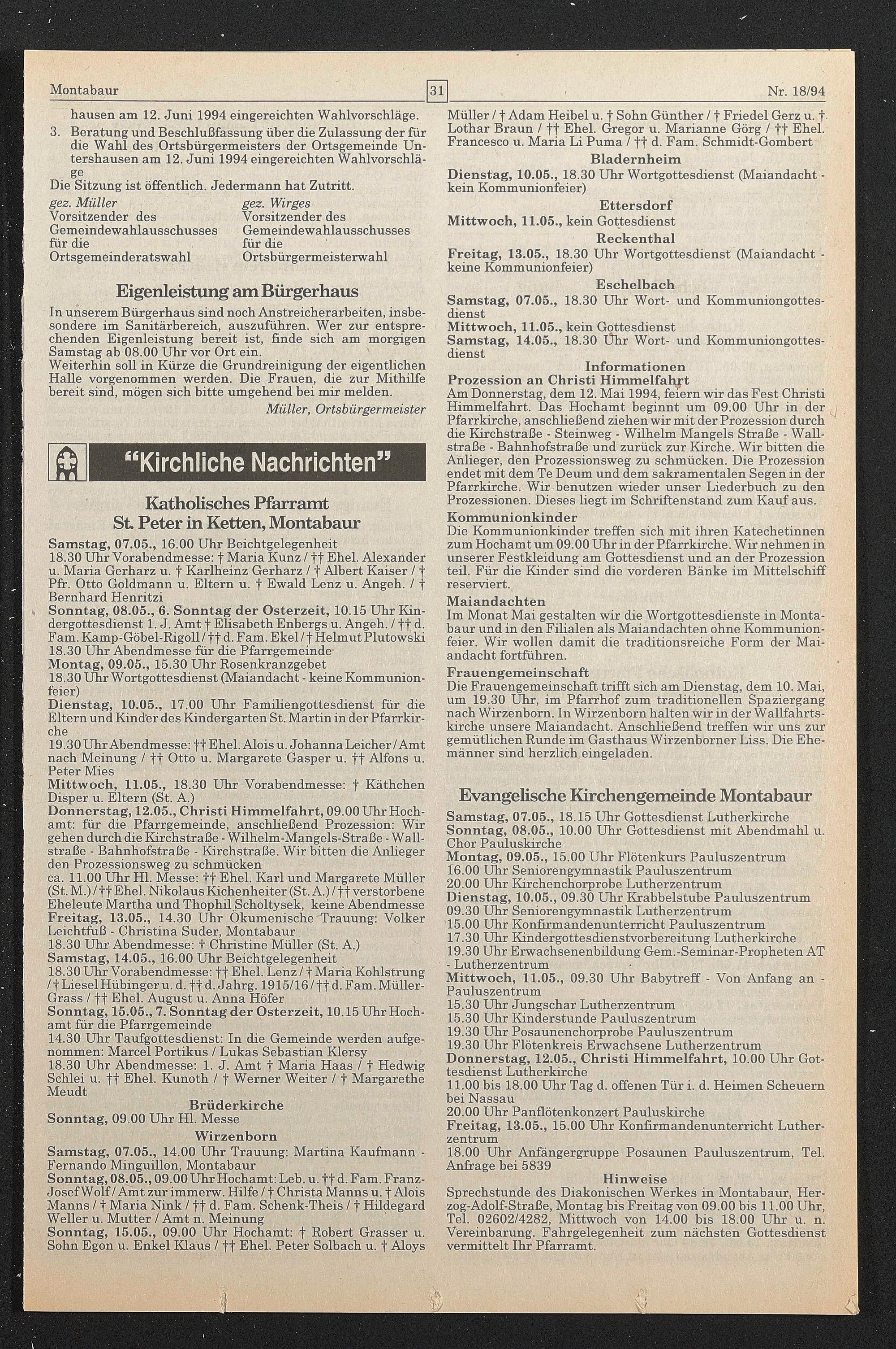 ca. 11,00 Uhr Hl. Messe: ff Ehel. Karl und Margarete Müller (St. M.) / ff Ehel. Nikolaus Kichenheiter (St. A.) / ff verstorbene Eheleute Martha und Thophil Scholtysek, keine Abendmesse Freitag, 13.05., 14.30 Uhr Ökumenische "Trauung: Volker Leichtfuß - Christina Suder, Montabaur