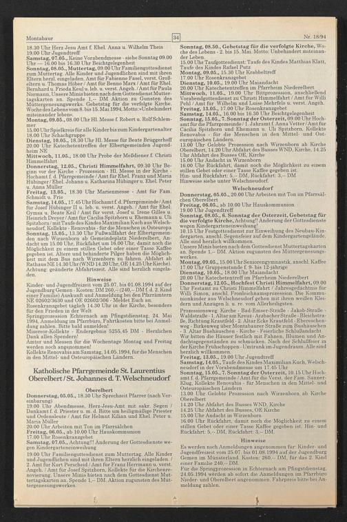 Samstag, 07.05., Keine Vorabendmesse - siehe Sonntag 09.00 Uhr — 16.00 bis 16.30 Uhr Beichtgelegenheit Sonntag, 08.05., Muttertag, 09.00 Uhr Familiengottesdienst zum Muttertag. Alle Kinder und Jugendlichen sind mit ihren Eltern herzl. eingeladen. Amt für Fabienne Fasel, verst. Großeltern u. Thomas Höher / Amt für Benno Marx / Amt für Ehel. Bernhard u. Frieda Keul u. leb. u. verst. Angeh. / Amt für Paula Normann, Unsere Minis bieten nach dem Gottesdienst Muttertagskarten an. Spende 1,- DM Aktion zu Gunsten des Müttergenesungswerks. Gebetstag für die verfolgte Kirche. Woche des Lebens vom 8. bis 15. Mai 1994, Motto: »Unbehindert miteinander leben«.
