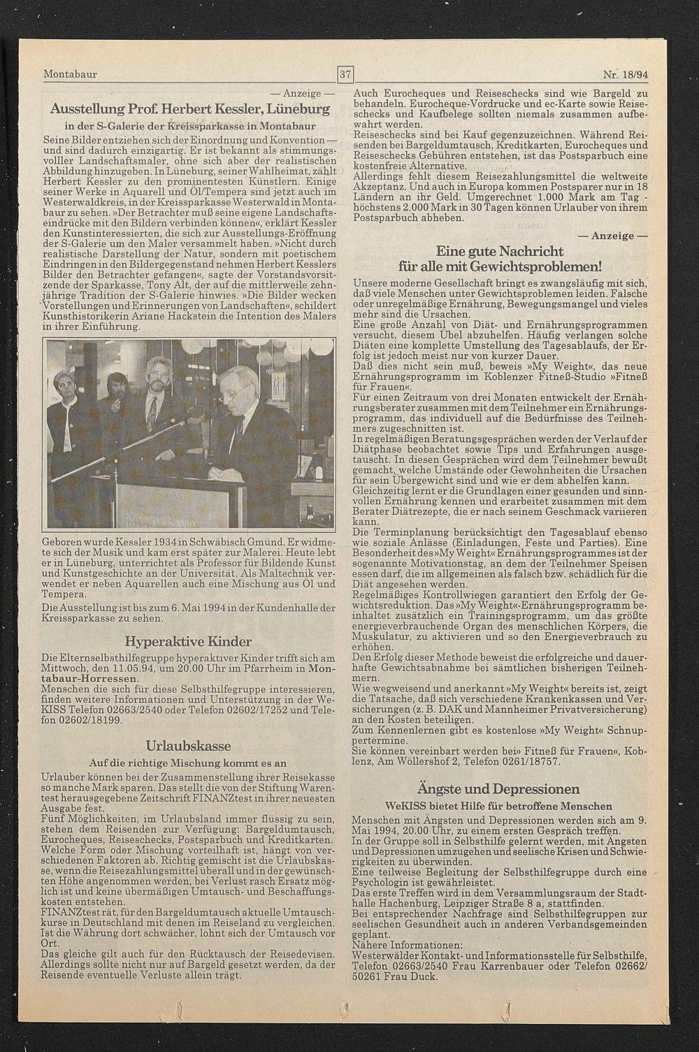 Seine Bilder entziehen sich der Einordnung und Konvention— und sind dadurch einzigartig. Er ist bekannt als stimmungs- volller Landschaftsmaler, ohne sich aber der realistischen Abbildung hinzugeben. In Lüneburg, seiner Wahlheimat, zählt Herbert Kessler zu den prominentesten Künstlern. Einige seiner Werke in Aquarell und Ol/Tempera sind jetzt auch im Westerwaldkreis, in der Kreissparkasse Westerwald inMonta- baur zu sehen. »Der Betrachter muß seine eigene Landschaftseindrücke mit den Bildern verbinden können«, erklärt Kessler den Kunstinteressierten, die sich zur Ausstellungs-Eröffnung der S-Galerie um den Maler versammelt haben. »Nicht durch realistische Darstellung der Natur, sondern mit poetischem Eindringen in den Bilder gegenstand nehmen Herbert Kesslers Bilder den Betrachter gefangen«, sagte der Vorstandsvorsitzende der Sparkasse, Tony Alt, der auf die mittlerweile zehnjährige Tradition der S-Galerie hinwies. »Die Bilder wecken "Vorstellungen und Erinnerungen von Landschaften«, schildert Kunsthistorikerin Ariane Hackstein die Intention des Malers in ihrer Einführung.
