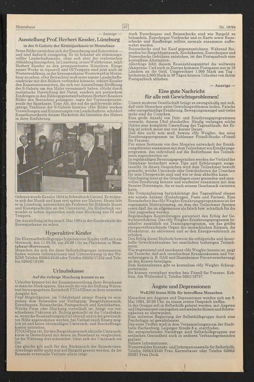 Die Ausstellung ist bis zum 6. Mai 1994 in der Kundenhalle der Kreissparkasse zu sehen.