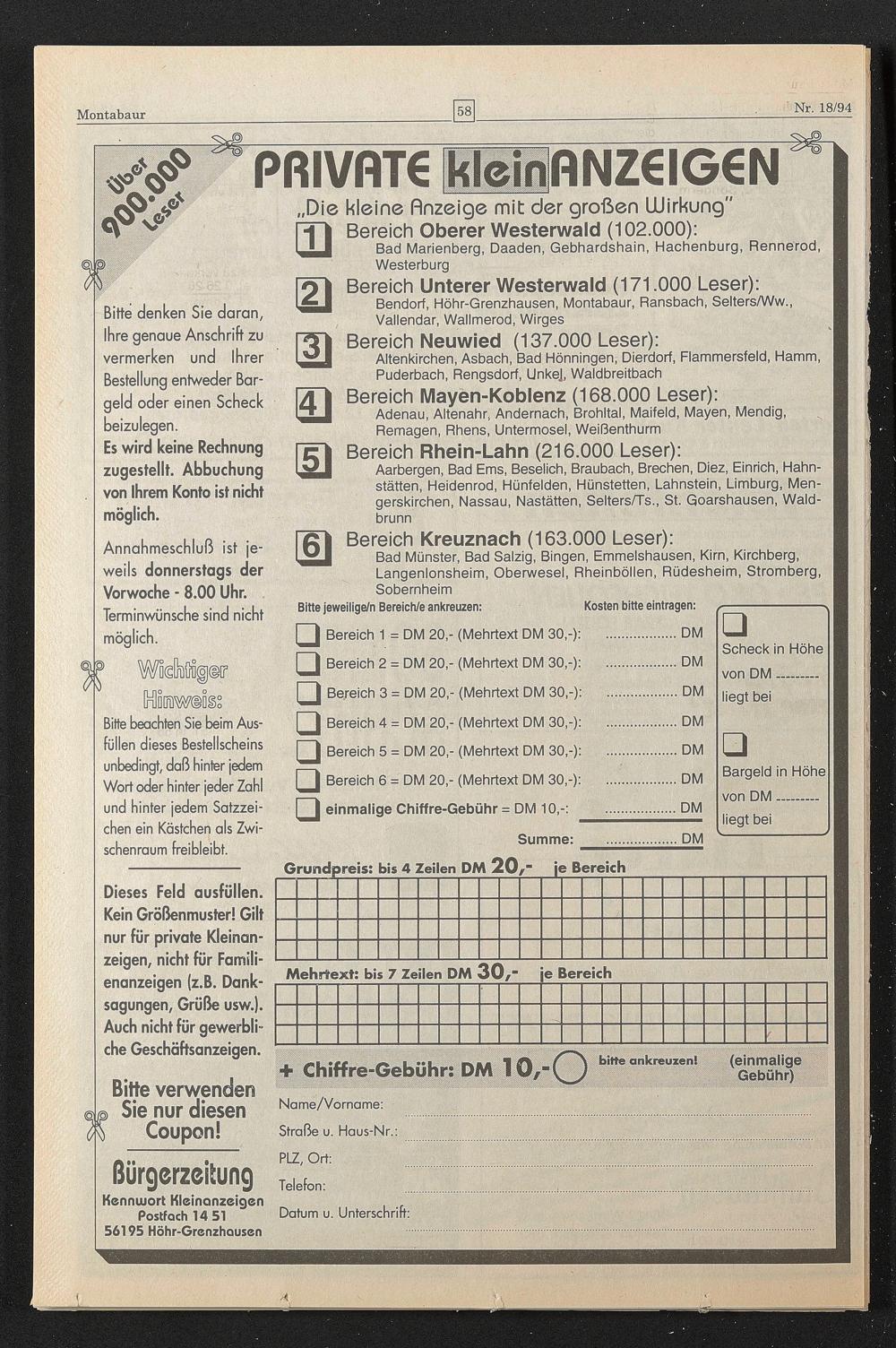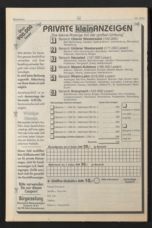 Bereich 1 = DM 20,- (Mehrtext DM 30,-)