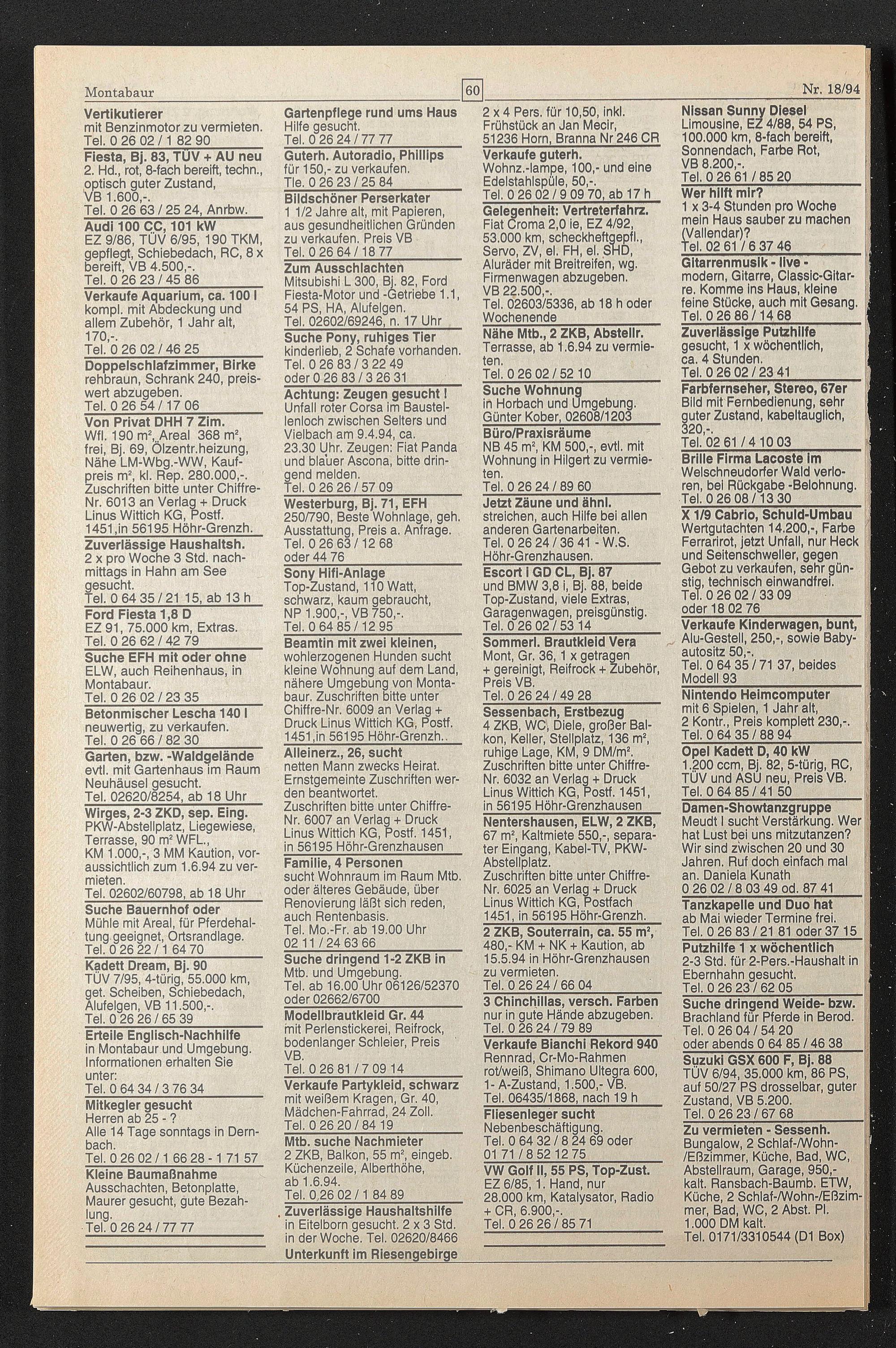 Sessenbach, Erstbezug 4 ZKB, WC, Diele, großer Balkon, Keller, Stellplatz, 136 m 2 , ruhige Lage, KM, 9 DM/m 2 . Zuschriften bitte unter Chiffre- Nr. 6032 an Verlag + Druck Linus Wittich KG, Postf. 1451, in 56195 Höhr-Grenzhausen