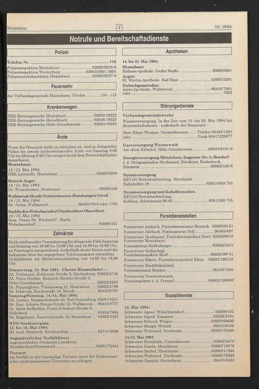 Wasserversorgung. In der Zeit vom 13. bis 20. Mai 1994 hat Bereitschaftsdienst - außerhalb der Dienstzeit -
