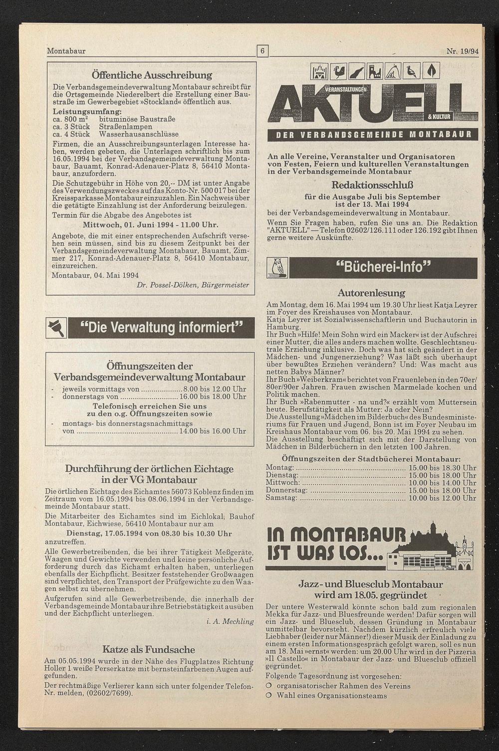 Die örtlichen Eichtage des Eichamtes 56073 Koblenz finden im Zeitraum vom 16.05.1994 bis 08.06.1994 in der Verbandsgemeinde Montabaur statt.