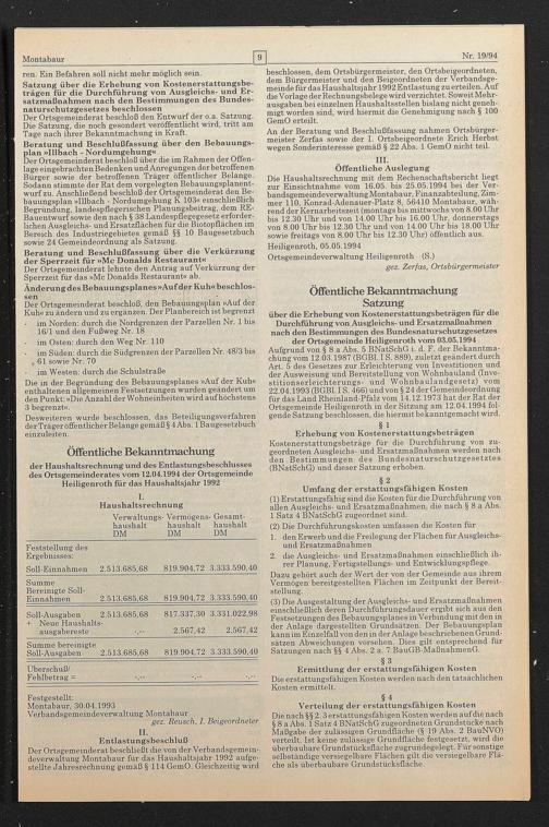 der Haushaltsrechnung und des Entlastungsbeschlusses des Ortsgemeinderates vom 12.04.1994 der Ortsgemeinde Heiligenroth für das Haushaltsjahr 1992