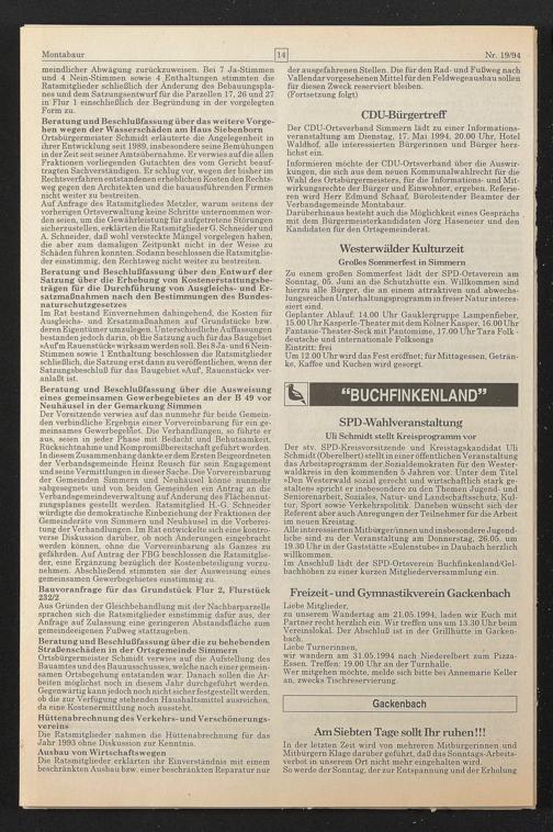 Der CDU-Ortsverband Simmern lädt zu einer Informationsveranstaltung am Dienstag, 17. Mai 1994, 20.00 Uhr, Hotel | Waldhof, alle interessierten Bürgerinnen und Bürger herz- lichst ein.