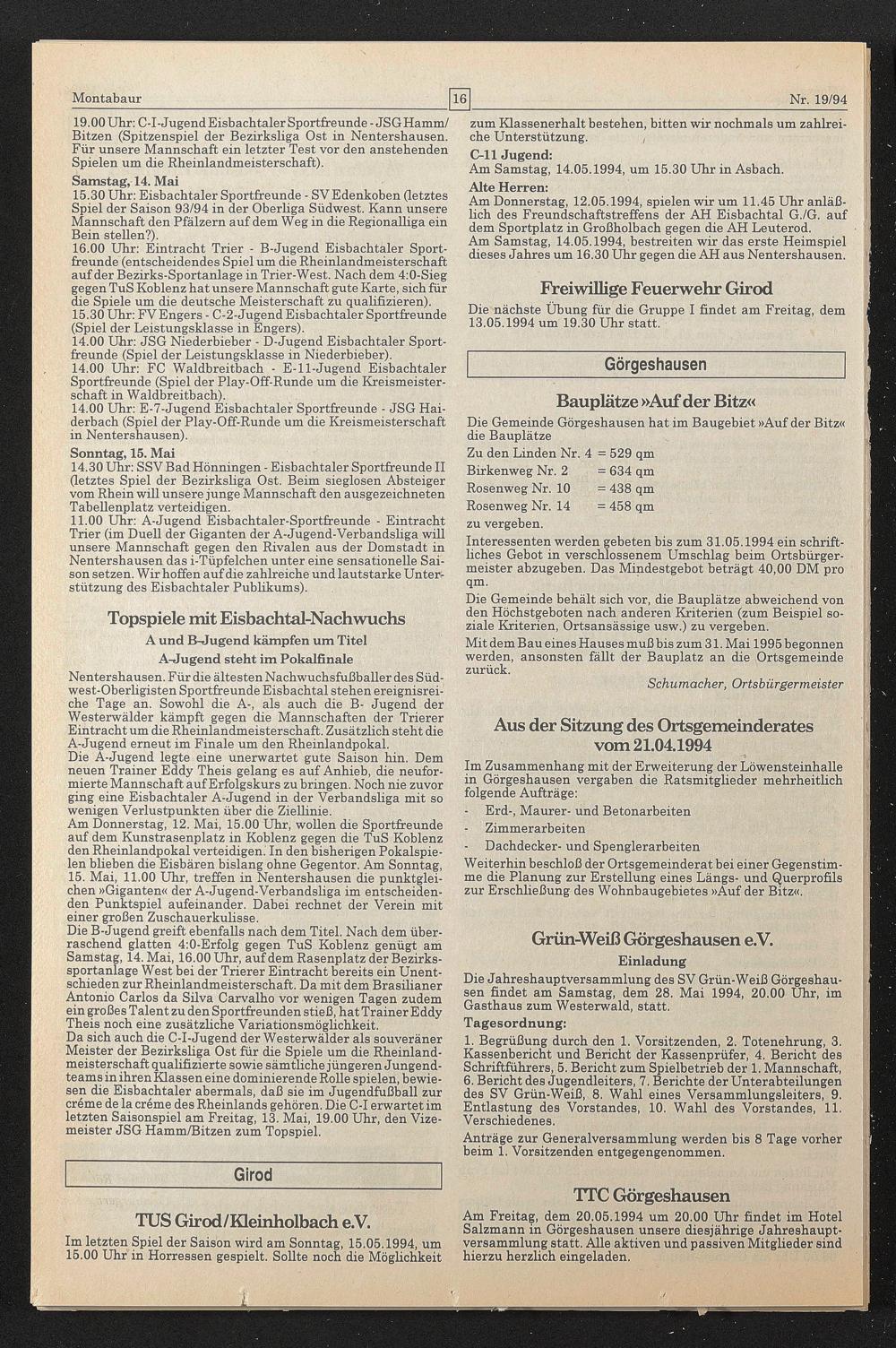 Aus der Sitzung des Ortsgemeinderates vom 21.04.1994