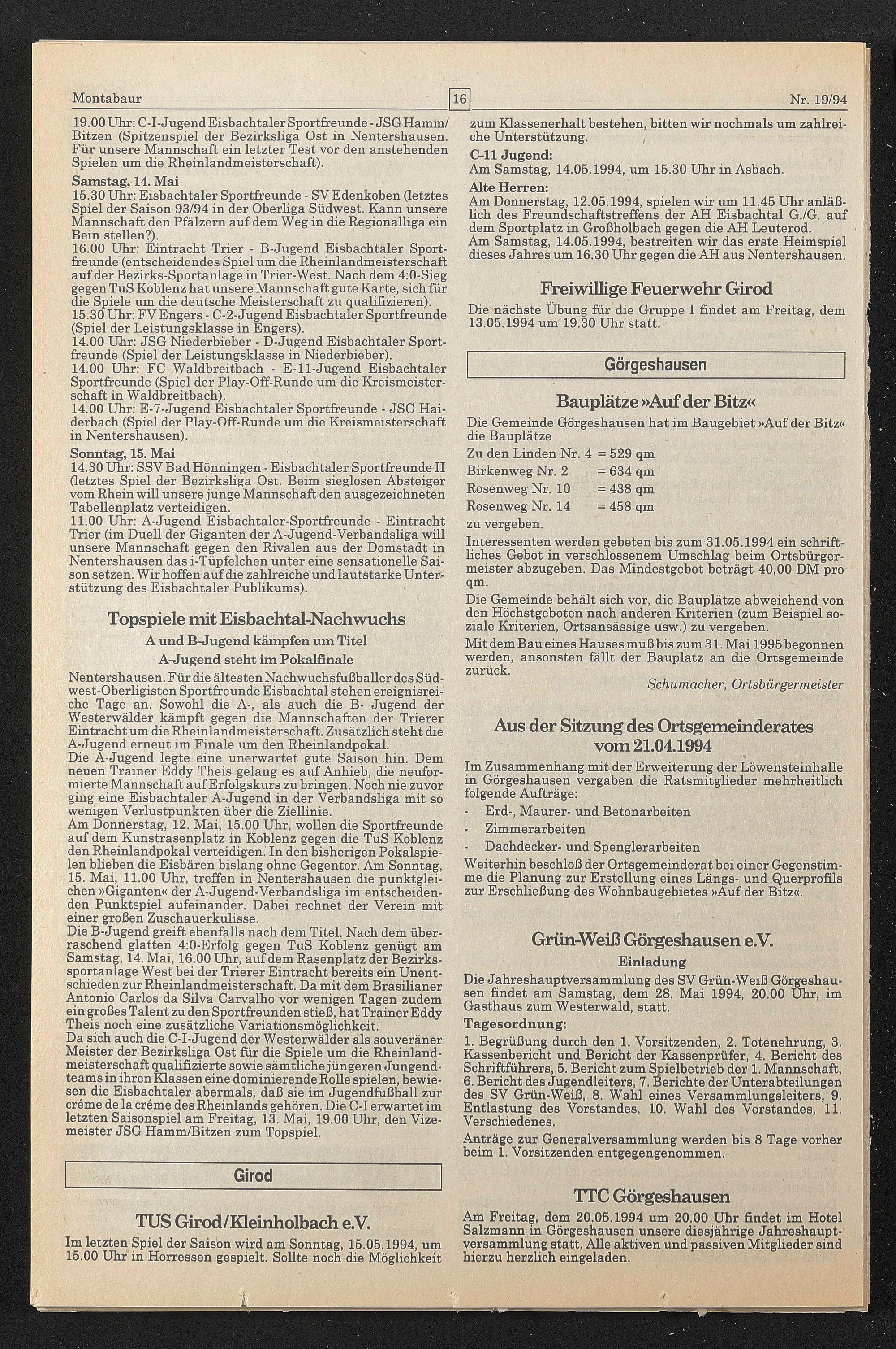 Die Jahreshauptversammlung des SV Grün-Weiß Görgeshausen findet am Samstag, dem 28. Mai 1994, 20.00 Uhr, im Gasthaus zum Westerwald, statt.