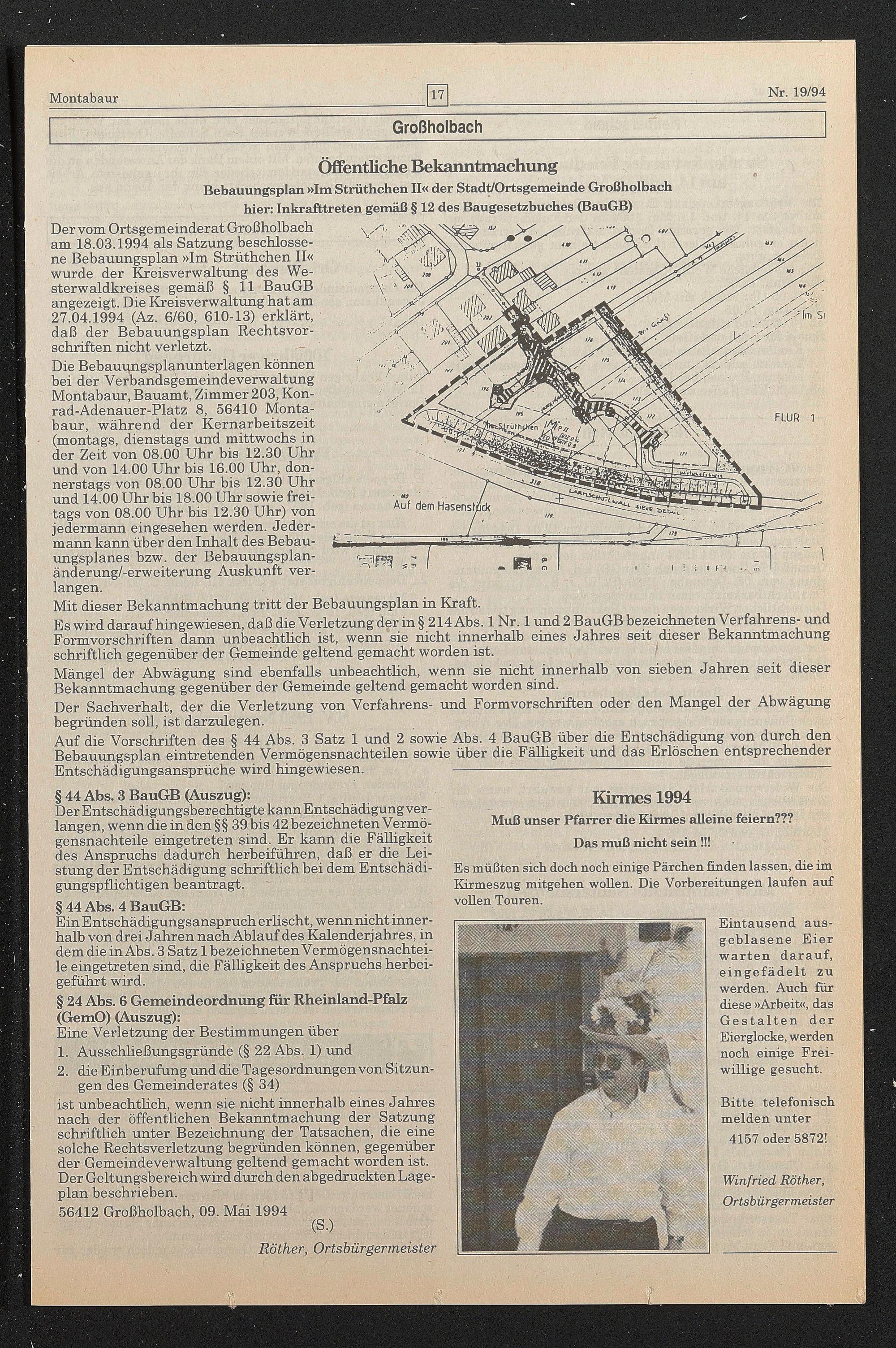 Der vom Ortsgemeinderat Großholbach am 18.03.1994 als Satzung beschlossene Bebauungsplan »Im Strüthehen II« wurde der Kreisverwaltung des Westerwaldkreises gemäß § 11 BauGB angezeigt. Die Kreisverwaltung hat am 27.04.1994 (Az. 6/60, 610-13) erklärt, daß der Bebauungsplan Rechtsvorschriften nicht verletzt.