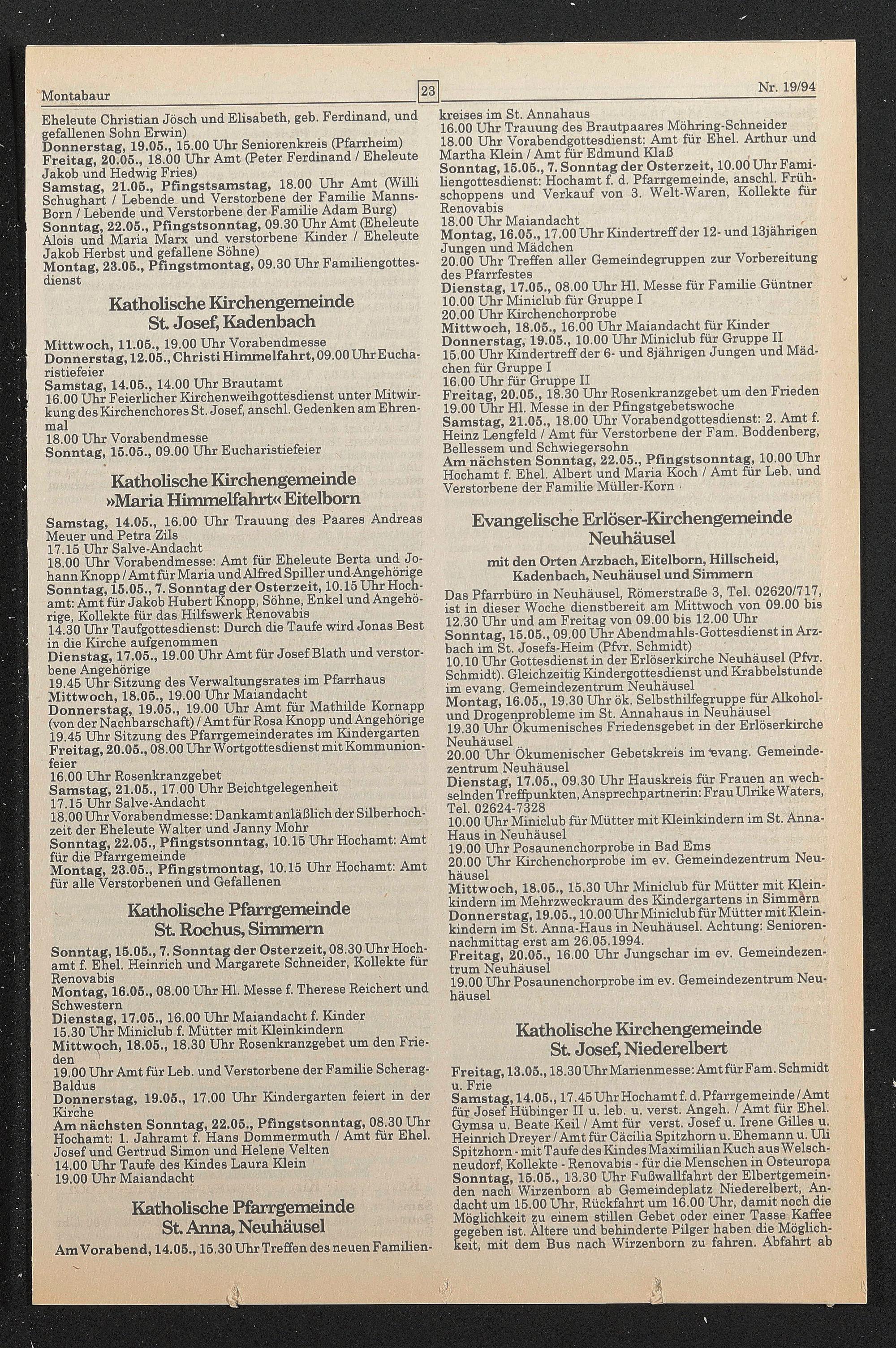 Am nächsten Sonntag, 22.05., Pfingstsonntag, 08.30 Uhr Hochamt: 1. Jahr amt f. Hans Dommermuth / Amt für Ehel. Josef und Gertrud Simon und Helene Velten 14.00 Uhr Taufe des Kindes Laura Klein 19.00 Uhr Maiandacht