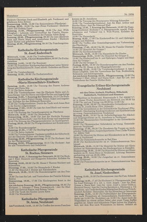 10.10 Uhr Gottesdienst in der Erlöserkirche Neuhäusel (Pfor. Schmidt). Gleichzeitig Kindergottesdienst und Krabbelstunde im evang. Gemeindezentrum Neuhäusel Montag, 16.05., 19.30 Uhr ök. Selbsthilfegruppe für Alkohol- und Drogenprobleme im St. Annahaus in Neuhäusel
