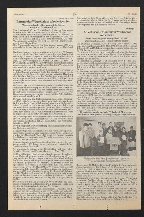Die Wohnungsbaukredite der Sparkassen waren 1993 eine wesentliche Stütze der guten Baukonjunktur in Rheinland- Pfalz.