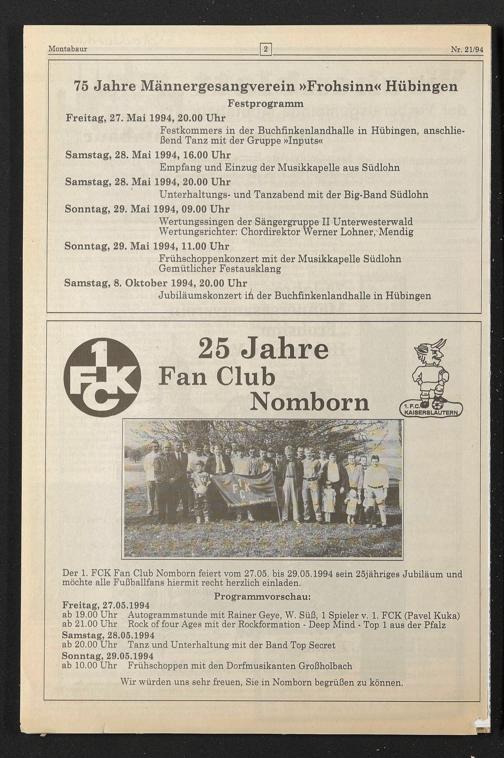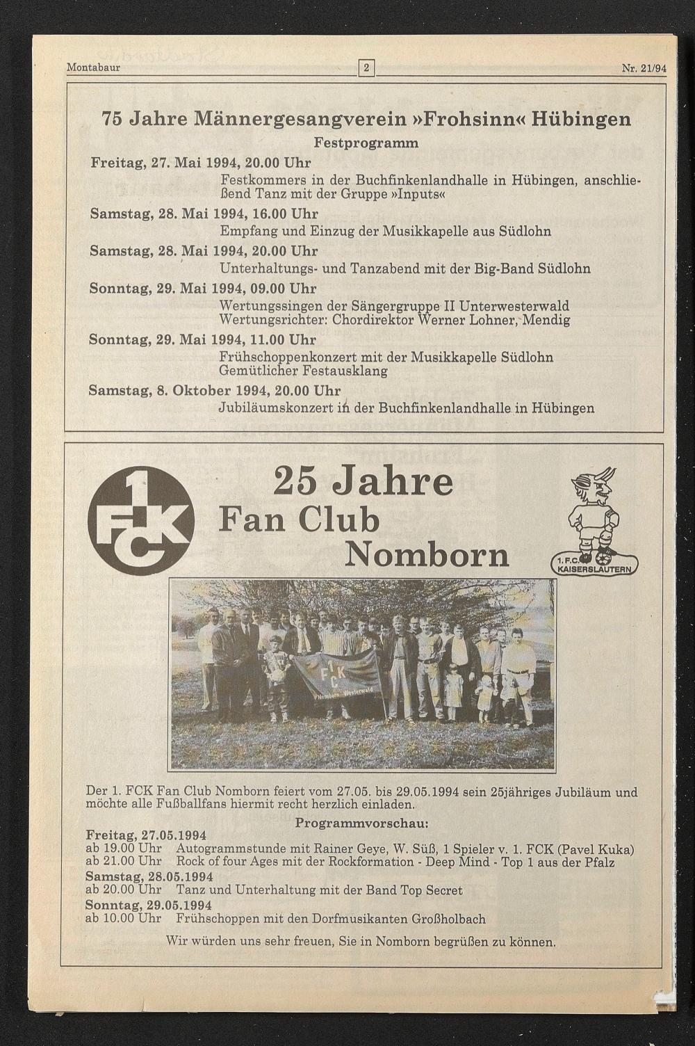 Der 1. FCK Fan Club Nomborn feiert vom 27.05. bis 29.05.1994 sein 25jähriges Jubiläum und möchte alle Fußballfans hiermit recht herzlich einladen.