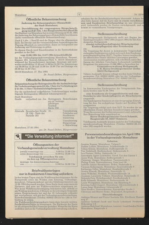 vom 13.06.1994 bis 13.07.1994 (einschließlich) bei der Verbandsgemeindeverwaltung Montabaur, Bauamt, Zimmer 203, Konrad-Adenauer-Platz 8, 56410 Montabaur, während der Kernarbeitszeit (montags, dienstags und mittwochs von 08.00 bis 12.30 und 14.00 bis 16.00 Uhr, donnerstags von 08.00 bis 12.30 und 14.00 bis 18.00 Uhr und freitags von 08.00 bis 12.30 Uhr).