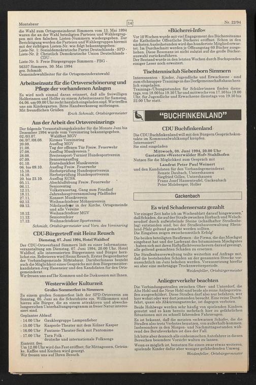 Dienstag, 07. Juni 1994, Hotel Waldhof Der CDU-Ortsverband Simmern lädt zu einer Informationsveranstaltung am Dienstag, 07. Juni 1994, 20.00 Uhr, Hotel Waldhof, alle interessierten Bürgerinnen und Bürger herz- lichst ein. Referieren wird Heinz Reusch, Erster Beigeordneter der Verbandsgemeinde Möütabaur. Darüberhinaus besteht auch die Möglichkeit eines Gesprächs mit dem Bürgermeisterkandidaten Jörg Haseneier und den Kandidaten für den Ortsgemeinderat.