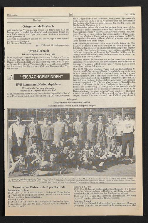 Die diesjährige Jahreshauptversammlung findet am Freitag, dem 03. Juni 1994 um 20.00 Uhr im Vereinslokal »Zum grünen Baum« in Horbach statt. Die Tagesordnung enthält u.a. folgende Punkte: Begrüßung; Totengedenken; Geschäftsbericht 1993/ 94; Entlastung des Vorstandes; Wahl von Kassenprüfer; Verschiedenes.