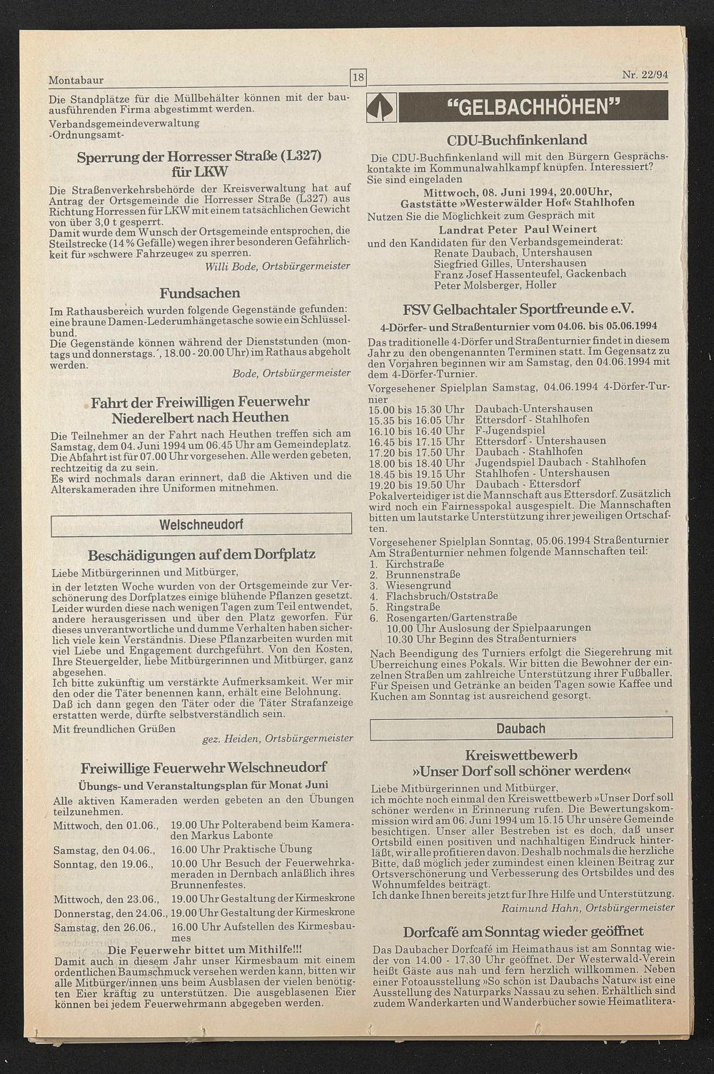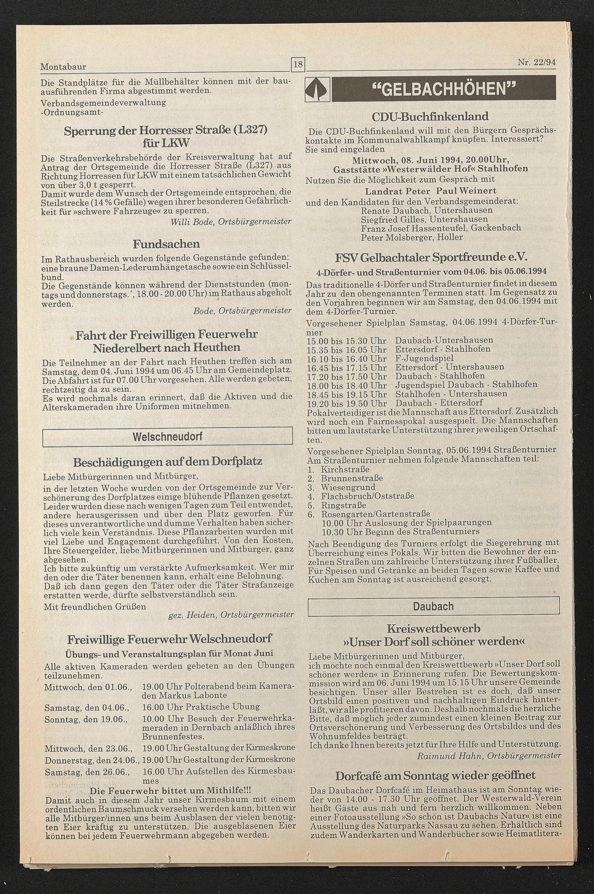 ich möchte noch einmal den Kreiswettbewerb »Unser Dorf soll schöner werden« in Erinnerung rufen. Die Bewertungskommission wird am 06. Juni 1994 um 15.15 Uhr unsere Gemeinde besichtigen. Unser aller Bestreben ist es doch, daß unser Ortsbild einen positiven und nachhaltigen Eindruck hinterläßt, wir alle profitieren davon. Deshalb nochmals die herzUche Bitte, daß mögfich jeder zumindest einen kleinen Beitrag zur Ortsverschönerung und Verbesserung des Ortsbildes und des Wohnumfeldes beiträgt.