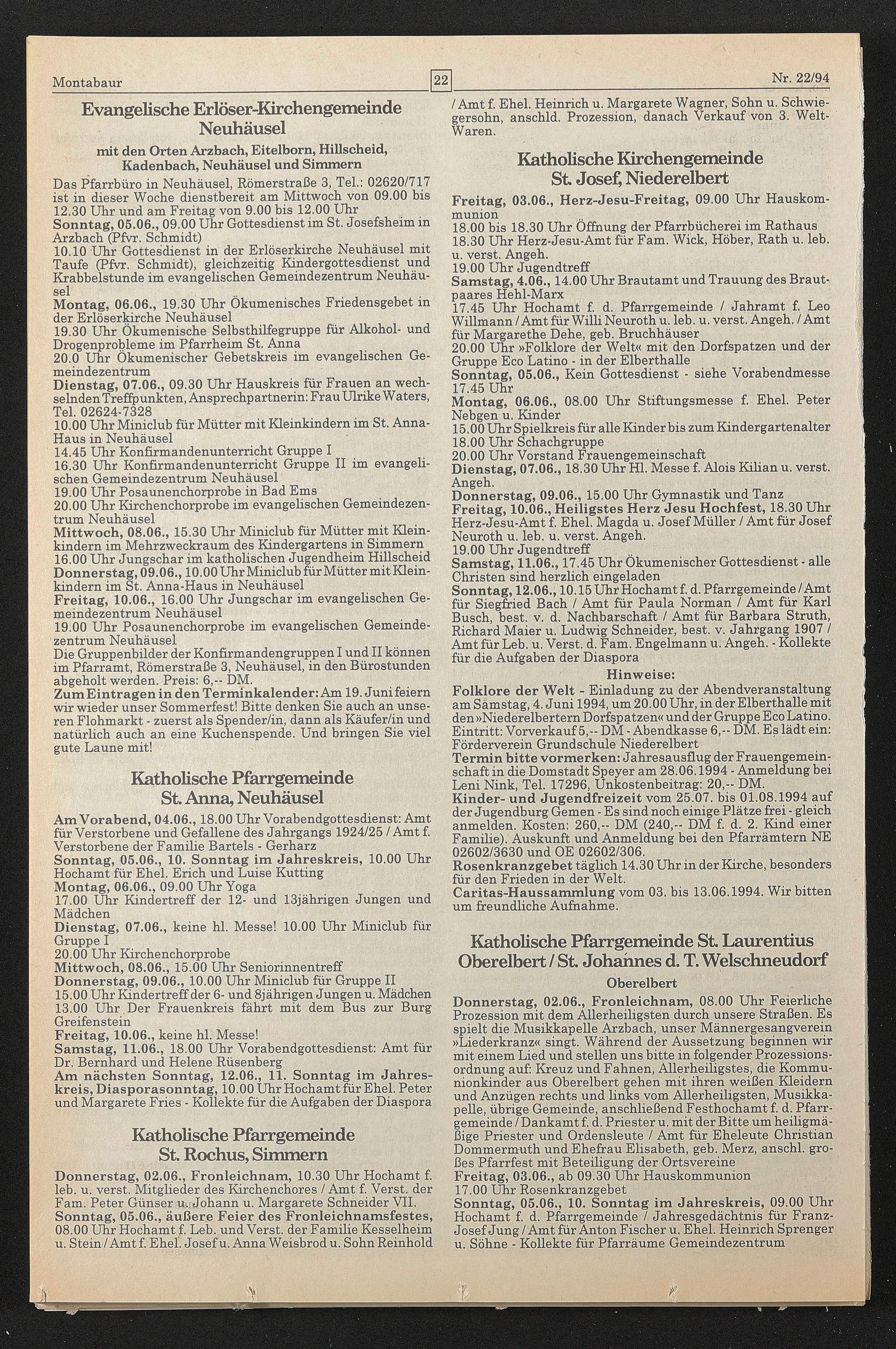 Folklore der Welt - Einladung zu der Abendveranstaltung am Samstag, 4. Juni 1994, um 20.00 Uhr, in der Elberthalle mit den »Niederelbertern Dorfspatzen« und der Gruppe Eco Latino. Eintritt: Vorverkauf 5,-- DM - Abendkasse 6,- DM. Es lädt ein: Förderverein Grundschule Niederelbert Termin bitte vormerken: Jahresausflug der Frauengemeinschaft in die Domstadt Speyer am 28.06.1994 - Anmeldung bei Leni Nink, Tel. 17296, Unkostenbeitrag: 20,- DM.