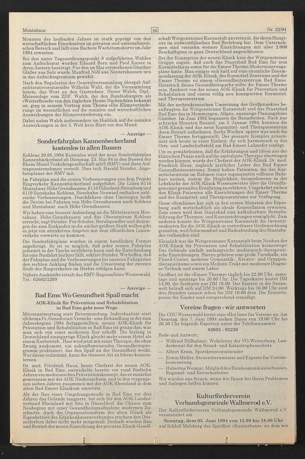 Koblenz 20.05.1994 Kostenlos wird der neue Sonderfahrplan Kannenbäckerland ab Dienstag, 23. Mai 94 in den Bussen der Rhein-Mosel Verkehrsgesellschaft mbH (RMV) und ihrer Auftragsunternehmen verteilt. Dies teilt Harald Strüder, Angebotsplaner der RMV mit.