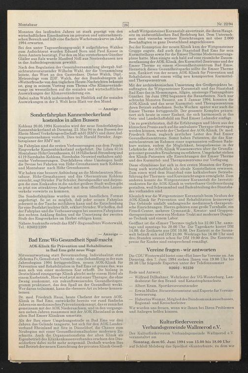 Mitverantwortung statt Bevormundung, Individualität statt »Schema F«, Genuß statt Verzicht - eine Behandlung in der zum Jahresbeginn 1994 fertiggestellten, neuen AOK-Klinik für Prävention und Rehabilitation in Bad Ems ist genau das, was man sich von einer modernen Kur erhofft. Die bislang in Deutschland einzigartige Klinik gleicht mehr einem Hotel als einem Kurbetrieb., Hier wird jetzt mit einer Therapie, die ohne Zwang auskommt, ein zukunftsweisendes Gesundheitsprogramm praktiziert, das den Spaß an der Gesundheit weckt. Wer daran teilnimmt, kann die »bessere Art zu leben« kennenlernen.