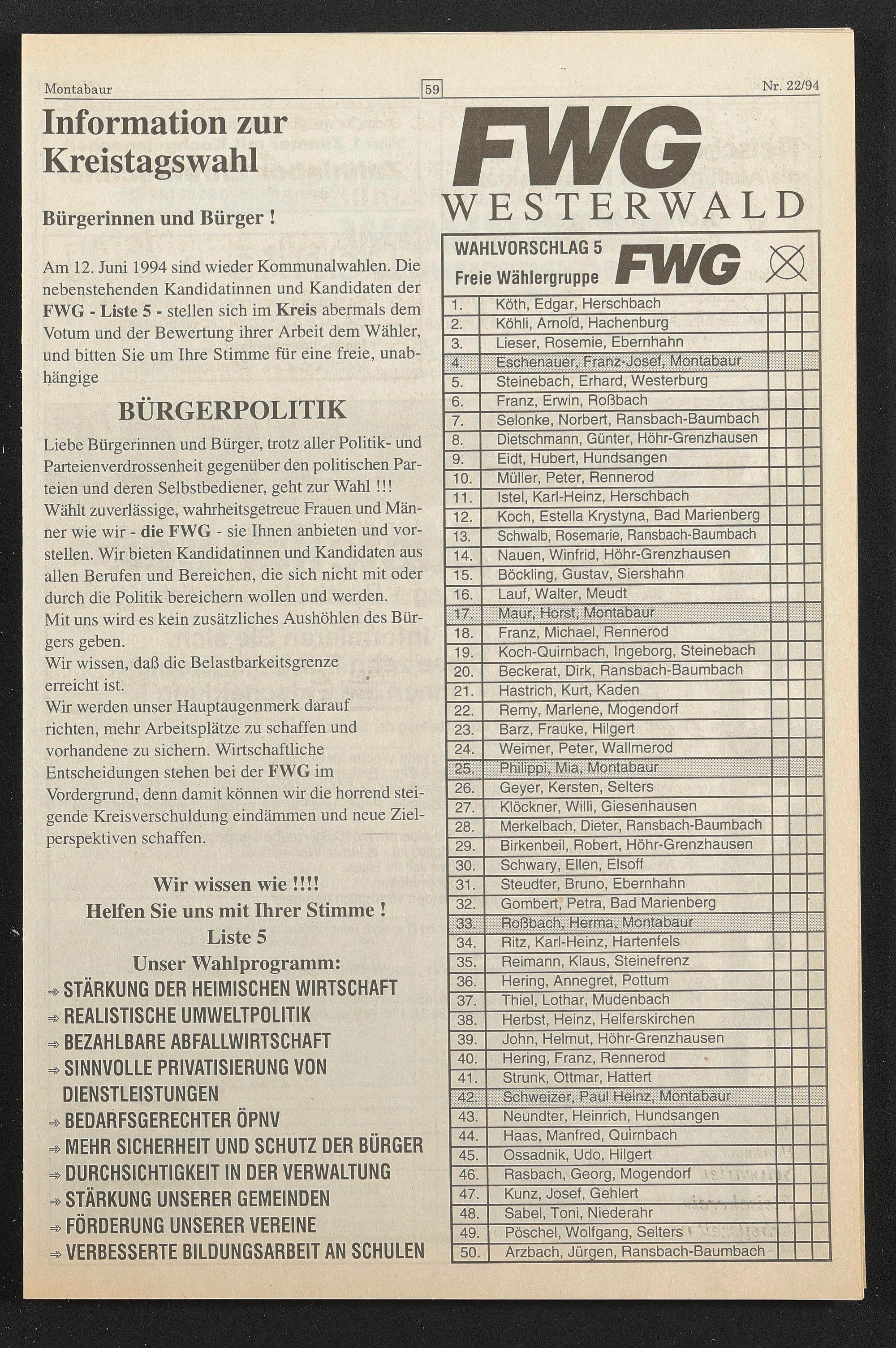 Am 12. Juni 1994 sind wieder Kommunal wählen. Die nebenstehenden Kandidatinnen und Kandidaten der FWG - Liste 5 - stellen sich im Kreis abermals dem Votum und der Bewertung ihrer Arbeit dem Wähler, und bitten Sie um Ihre Stimme für eine freie, unabhängige