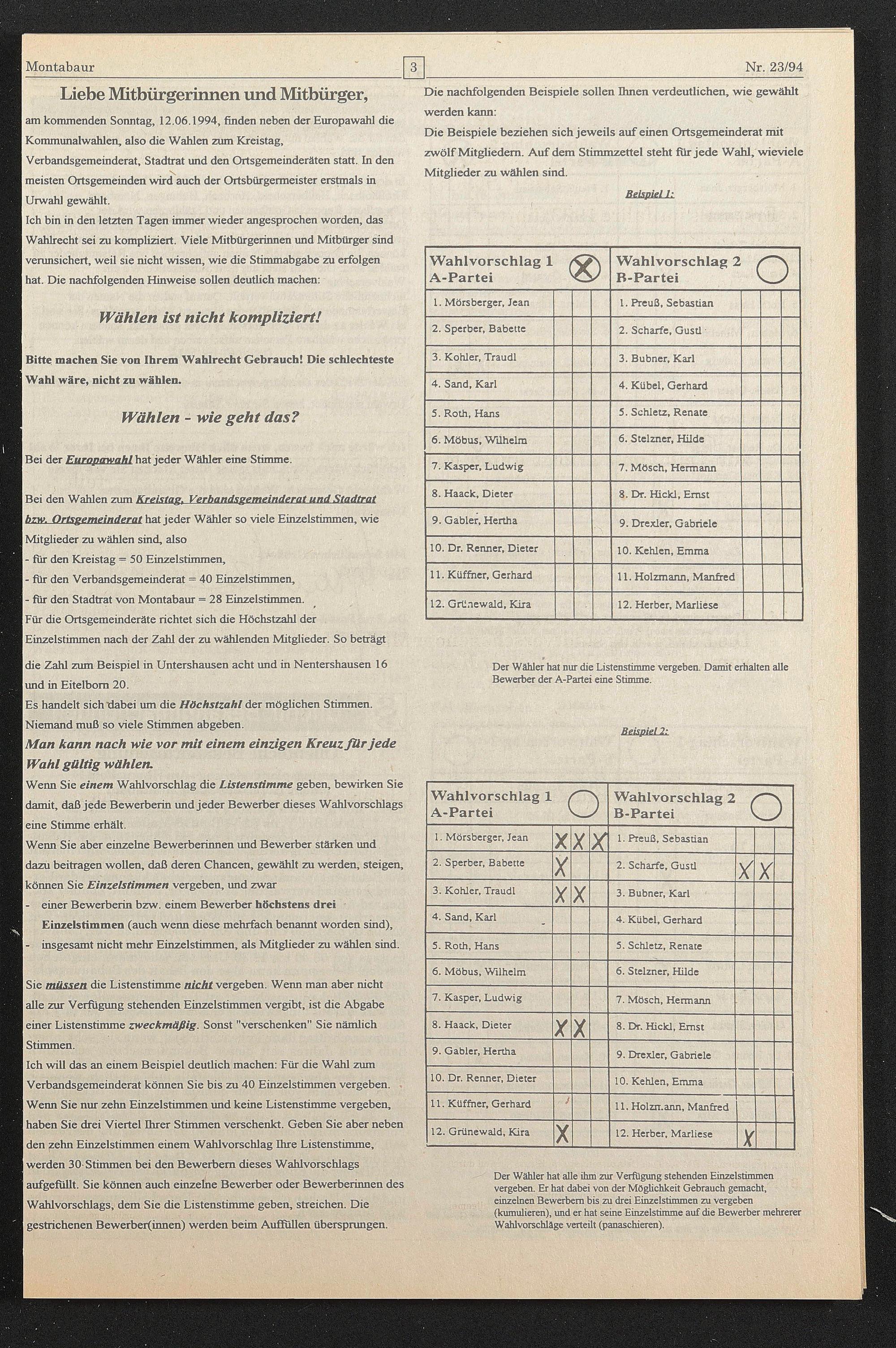 am kommenden Sonntag, 12.06.1994, finden neben der Europawahl die Kommunalwahlen, also die Wahlen zum Kreistag, Verbandsgemeinderat, Stadtrat und den Ortsgemeinderäten statt. In den meisten Ortsgemeinden wird'auch der Oitsbürgermeister erstmals in Urwahl gewählt.