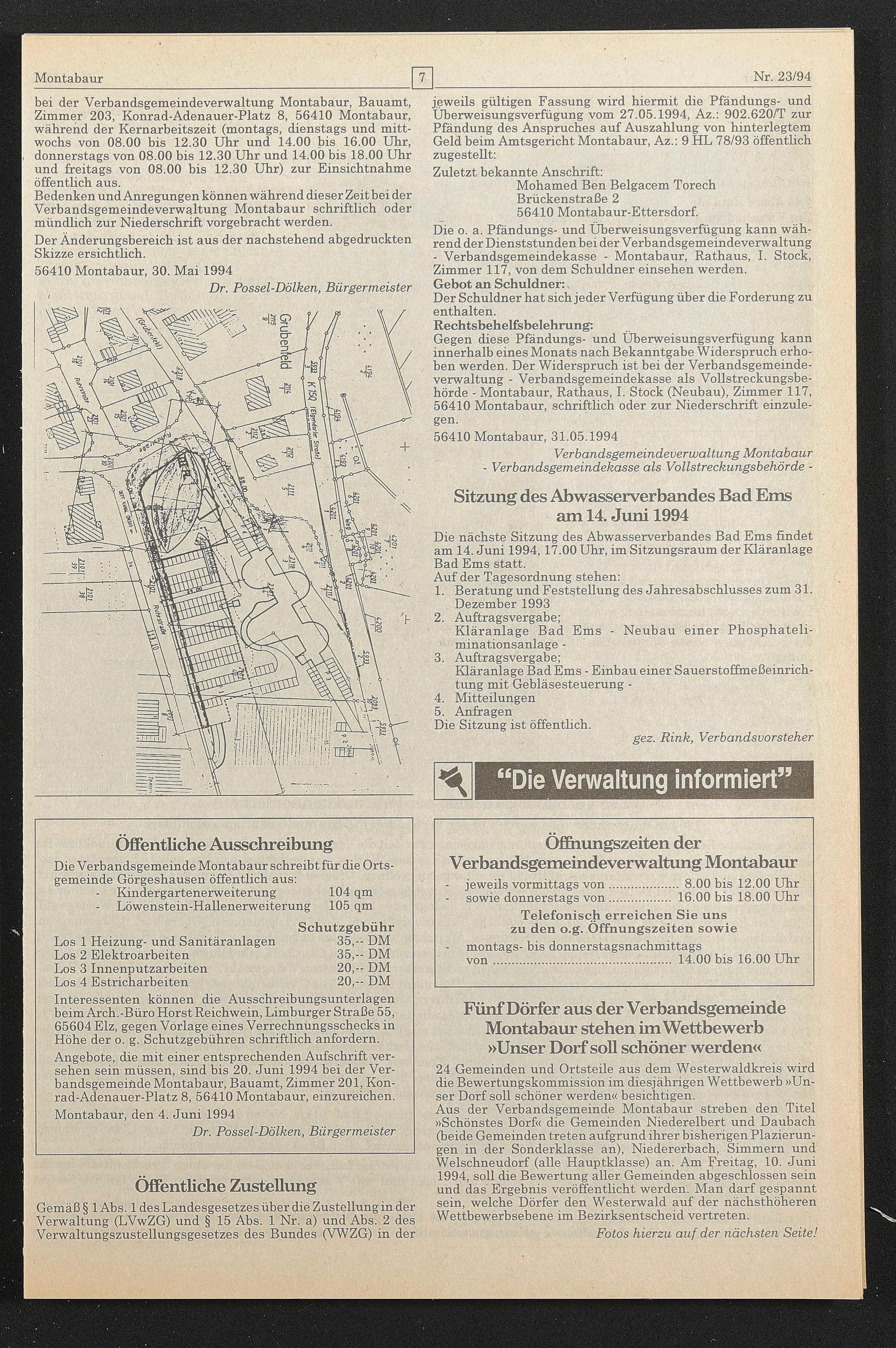 Die nächste Sitzung des Abwasserverbandes Bad Ems findet am 14. Juni 1994,17.00 Uhr, im Sitzungsraum der Kläranlage Bad Ems statt.