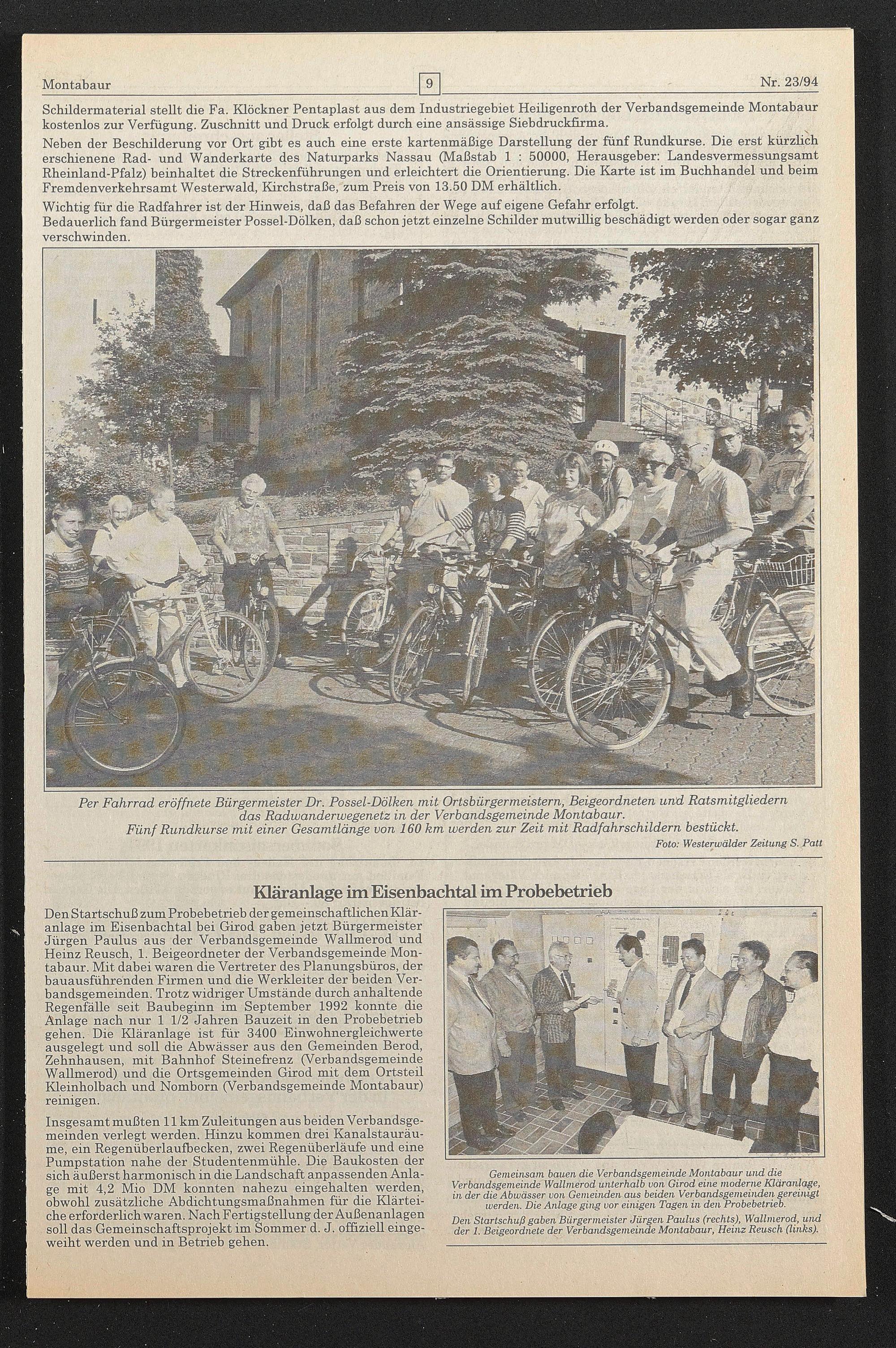 Den Startschuß zum Probebetrieb der gemeinschaftlichen Kläranlage im Eisenbachtal bei Girod gaben jetzt Bürgermeister Jürgen Paulus aus der Verbandsgemeinde Wallmerod und Heinz Reusch, 1. Beigeordneter der Verbandsgemeinde Montabaur. Mit dabei waren die Vertreter des Planungsbüros, der bauausführenden Firmen und die Werkleiter der beiden Verbandsgemeinden. Trotz widriger Umstände durch anhaltende Regenfälle seit Baubeginn im September 1992 konnte die Anlage nach nur 1 1/2 Jahren Bauzeit in den Probebetrieb gehen. Die Kläranlage ist für 3400 Einwohnergleichwerte ausgelegt und soll die Abwässer aus den Gemeinden Berod, Zehnhausen, mit Bahnhof Steinefrenz (Verbandsgemeinde Wallmerod) und die Ortsgemeinden Girod mit dem Ortsteil Kleinholbach und Nomborn (Verbandsgemeinde Montabaur) reinigen.