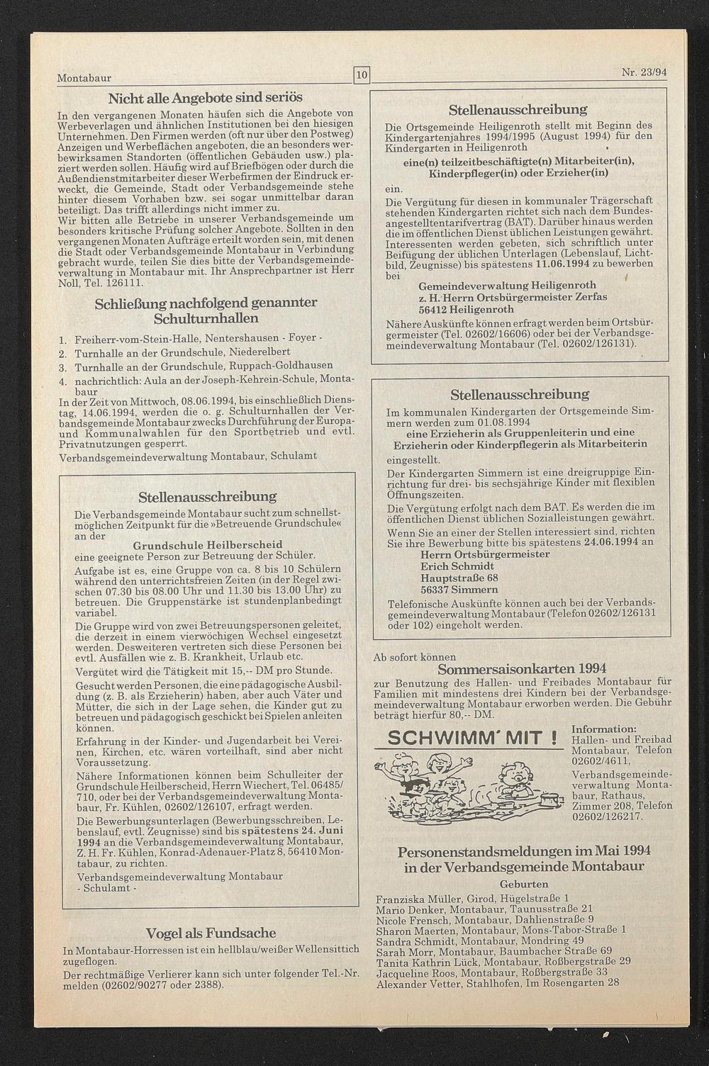 Personenstandsmeldungen im Mai 1994 in der Verbandsgemeinde Montabaur